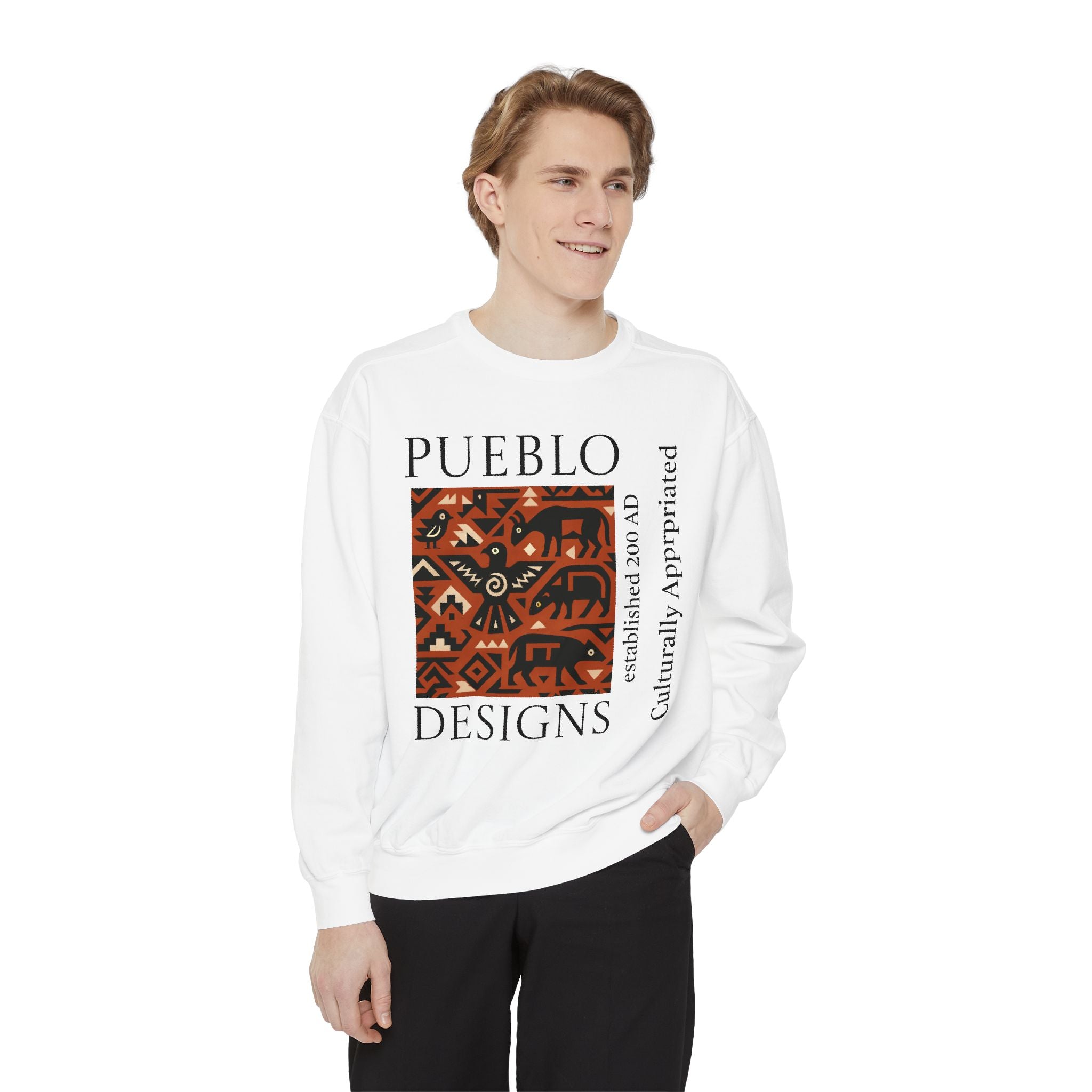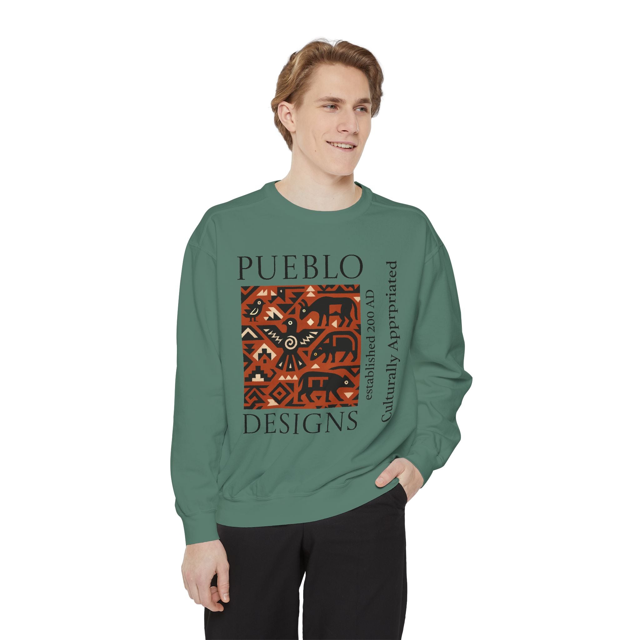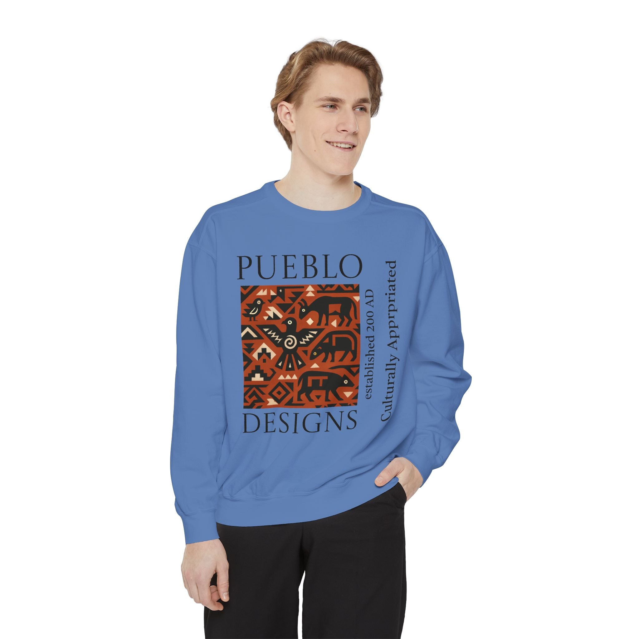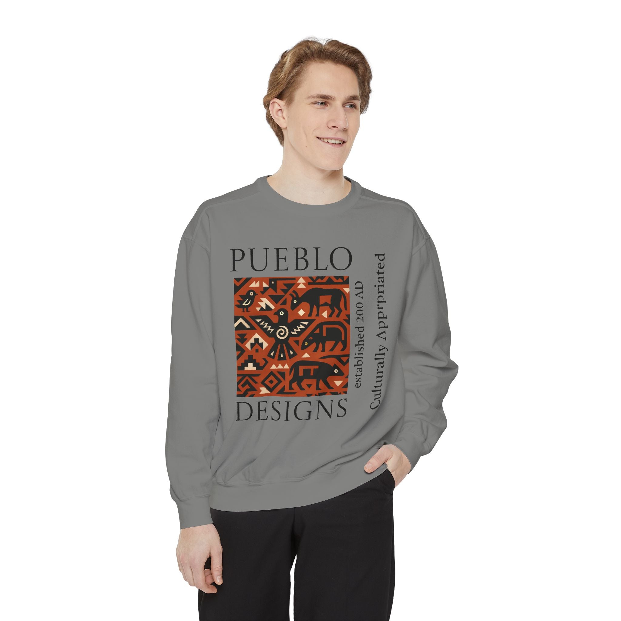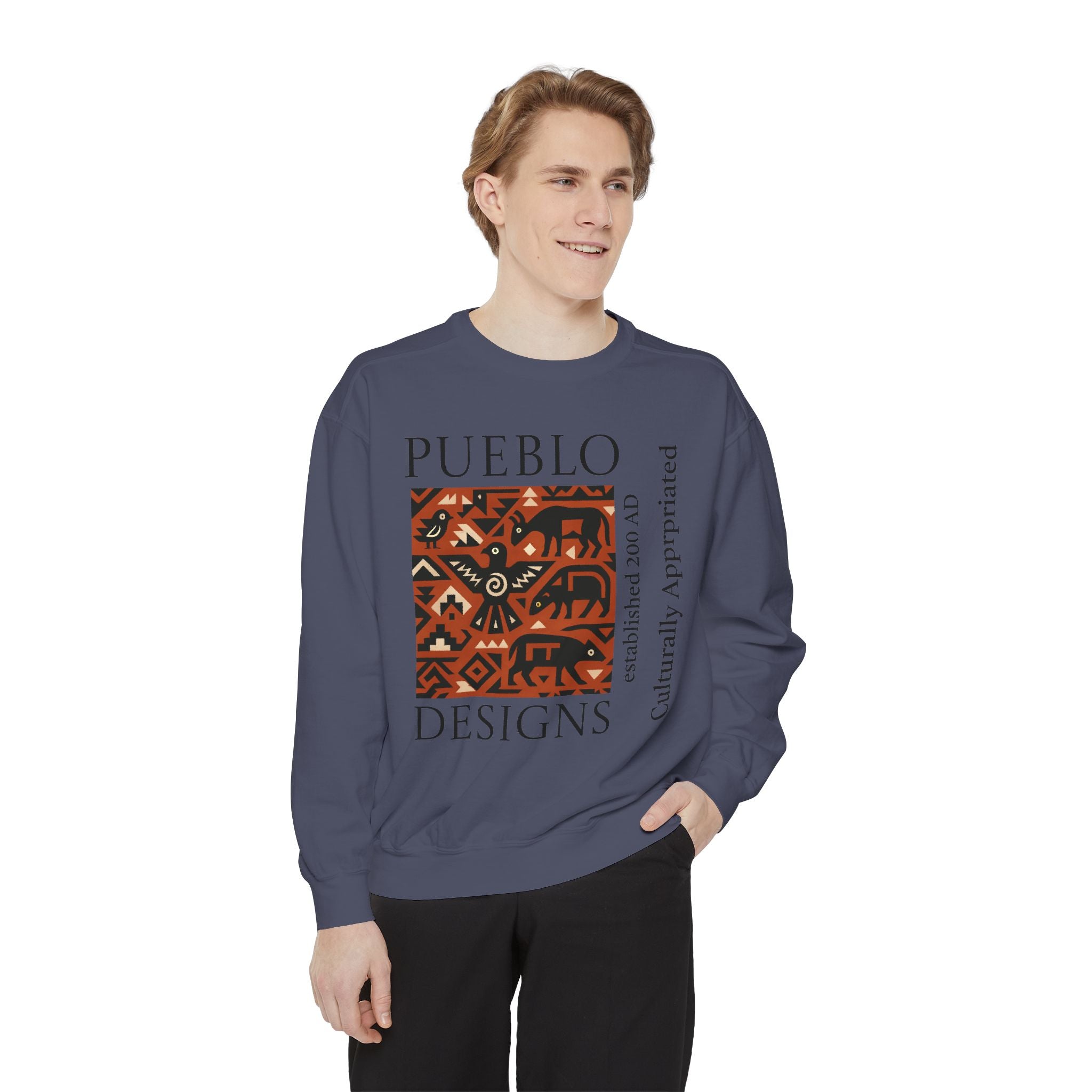 This relaxed-fit sweatshirt brings a grounded, heritage-driven look to everyday wear. A warm, geometric panel—echoing Pueblo textile motifs and animal figures—anchors the chest, while bold vertical lettering adds an editorial edge. The garment-dyed fabric feels soft and substantial, with ribbed collar, cuffs and hem that hold shape and a half-moon back patch for subtle structure. Wear it layered over a tee on cool mornings or as a cozy statement piece on weekend outings; it reads like a quiet nod to tradition with modern street-ready proportions. Product features - 80% ring-spun cotton / 20% polyester — soft, durable medium-heavy fabric (9.5 oz/yd²). - Relaxed fit with 1x1 ribbed collar, cuffs and bottom hem for stretch-and-recovery. - Twill neck tape and half-moon back patch for added stability and comfort. - Embroidery-capable print areas at left or center chest (decoration option). - OEKO-TEX certified low-impact dyes; sewn-in twill label; adult sizing; blanks sourced from Honduras/El Salvador. Care instructions - Machine wash: cold (max 30C or 90F) - Non-chlorine: bleach as needed - Tumble dry: low heat - Do not iron - Do not dryclean