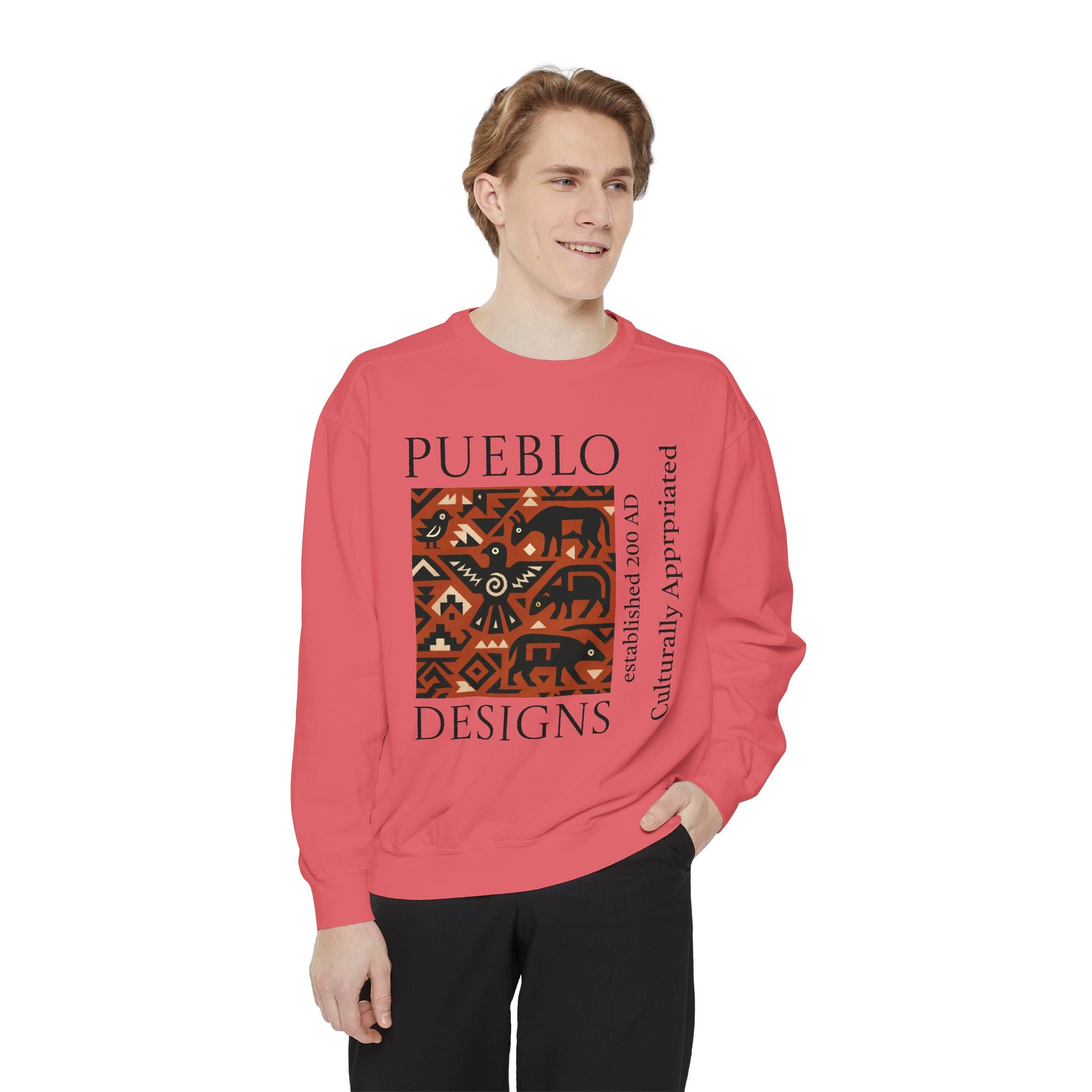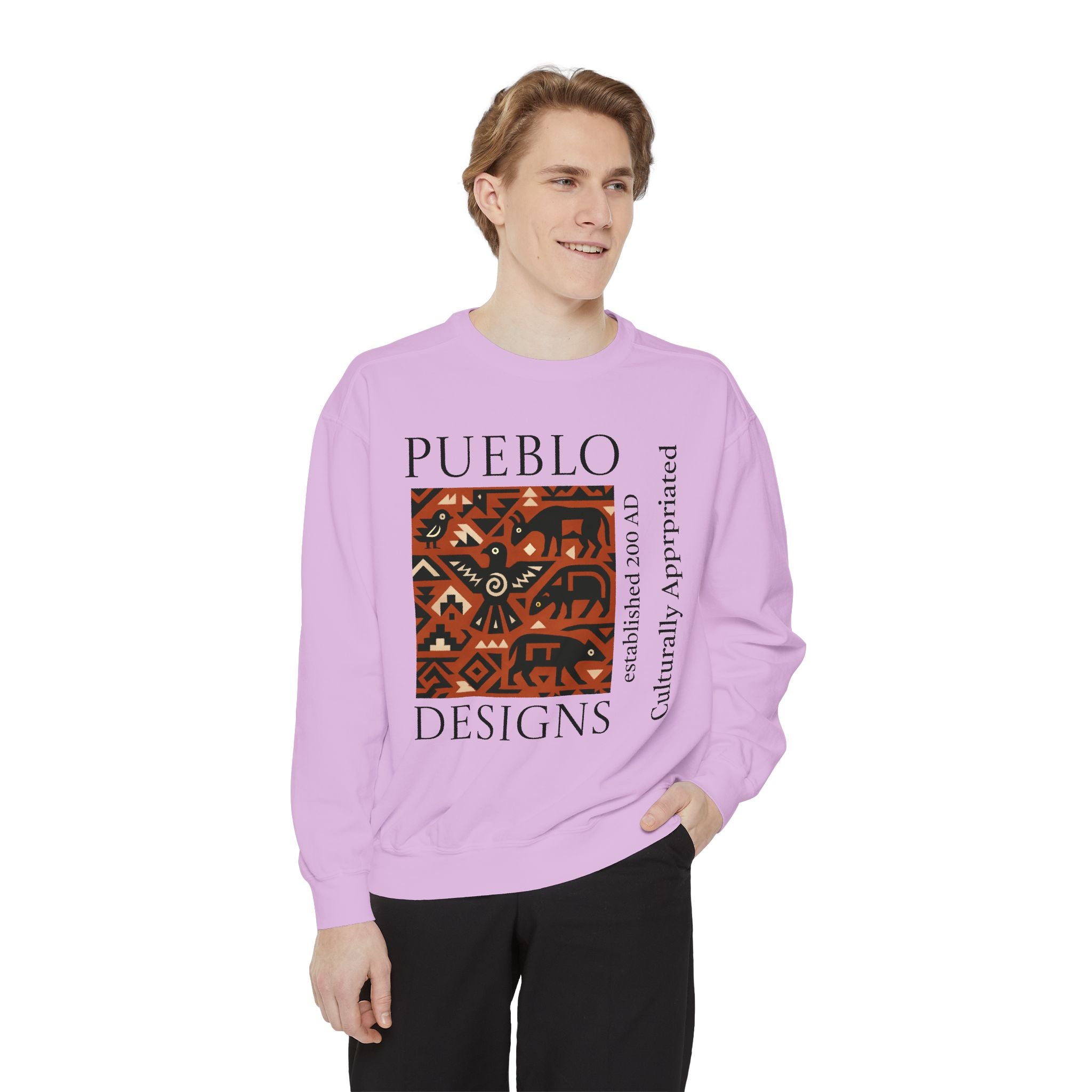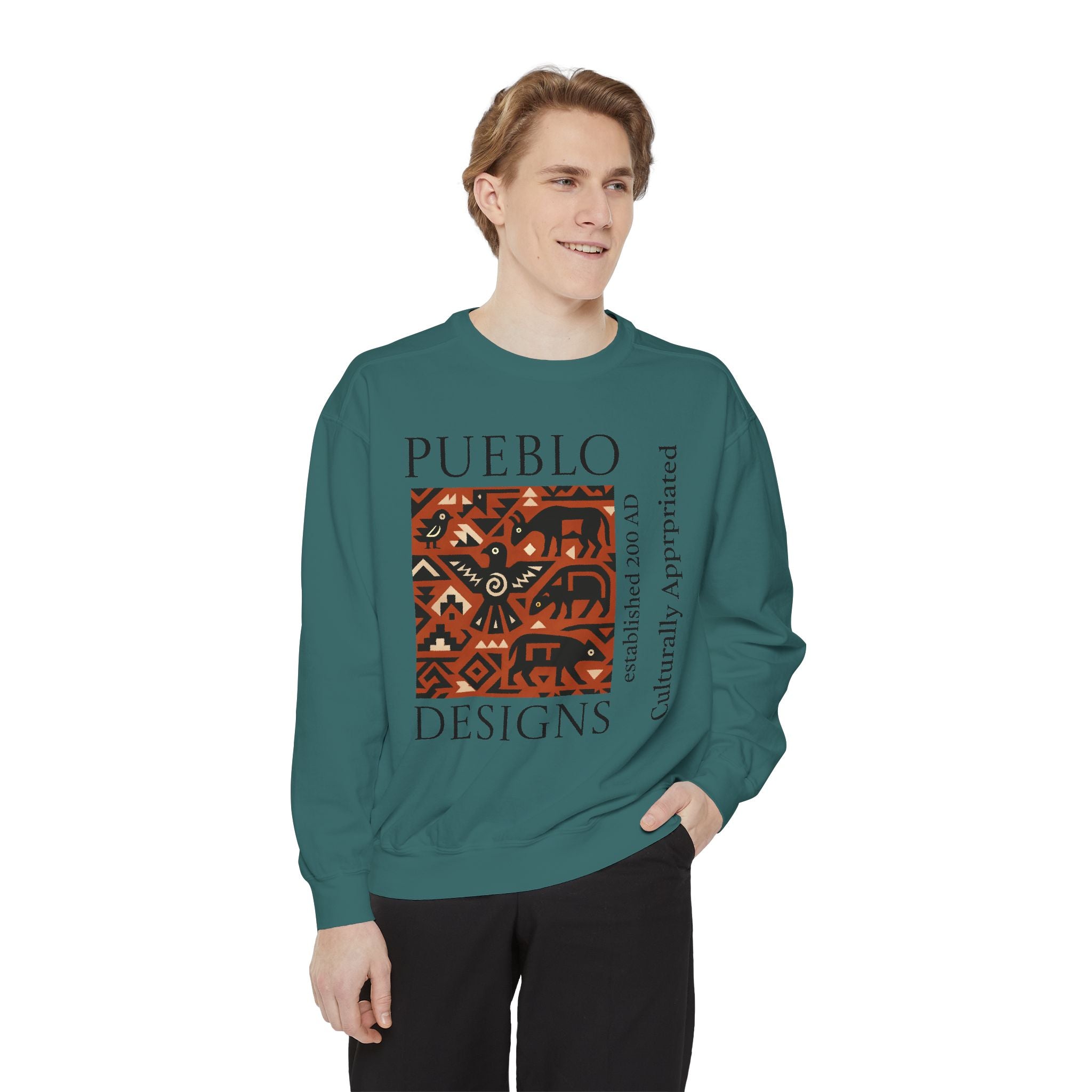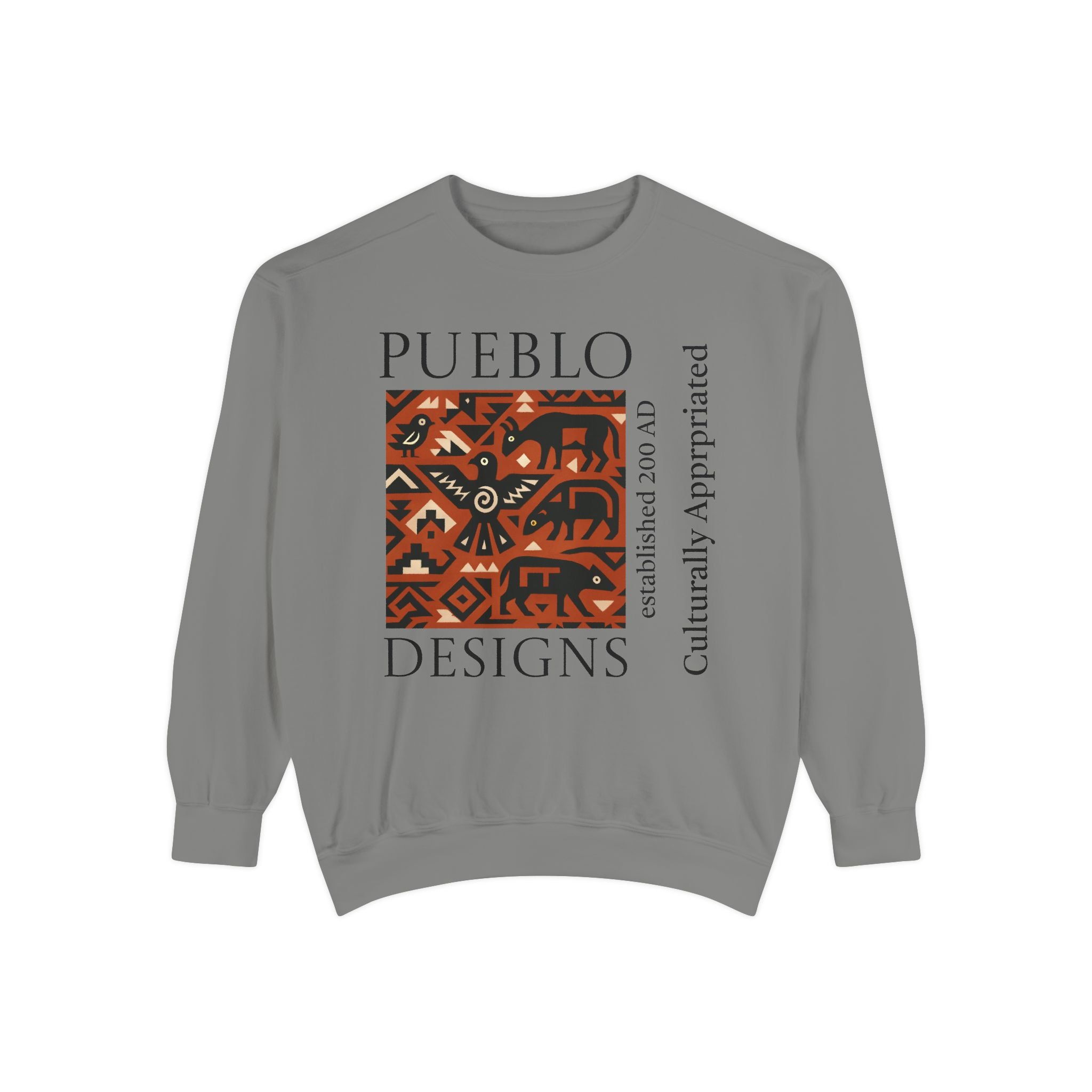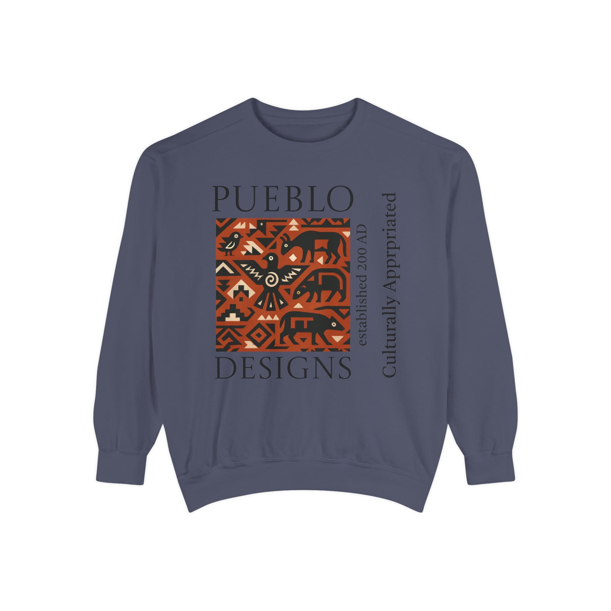 This relaxed-fit sweatshirt brings a grounded, heritage-driven look to everyday wear. A warm, geometric panel—echoing Pueblo textile motifs and animal figures—anchors the chest, while bold vertical lettering adds an editorial edge. The garment-dyed fabric feels soft and substantial, with ribbed collar, cuffs and hem that hold shape and a half-moon back patch for subtle structure. Wear it layered over a tee on cool mornings or as a cozy statement piece on weekend outings; it reads like a quiet nod to tradition with modern street-ready proportions. Product features - 80% ring-spun cotton / 20% polyester — soft, durable medium-heavy fabric (9.5 oz/yd²). - Relaxed fit with 1x1 ribbed collar, cuffs and bottom hem for stretch-and-recovery. - Twill neck tape and half-moon back patch for added stability and comfort. - Embroidery-capable print areas at left or center chest (decoration option). - OEKO-TEX certified low-impact dyes; sewn-in twill label; adult sizing; blanks sourced from Honduras/El Salvador. Care instructions - Machine wash: cold (max 30C or 90F) - Non-chlorine: bleach as needed - Tumble dry: low heat - Do not iron - Do not dryclean