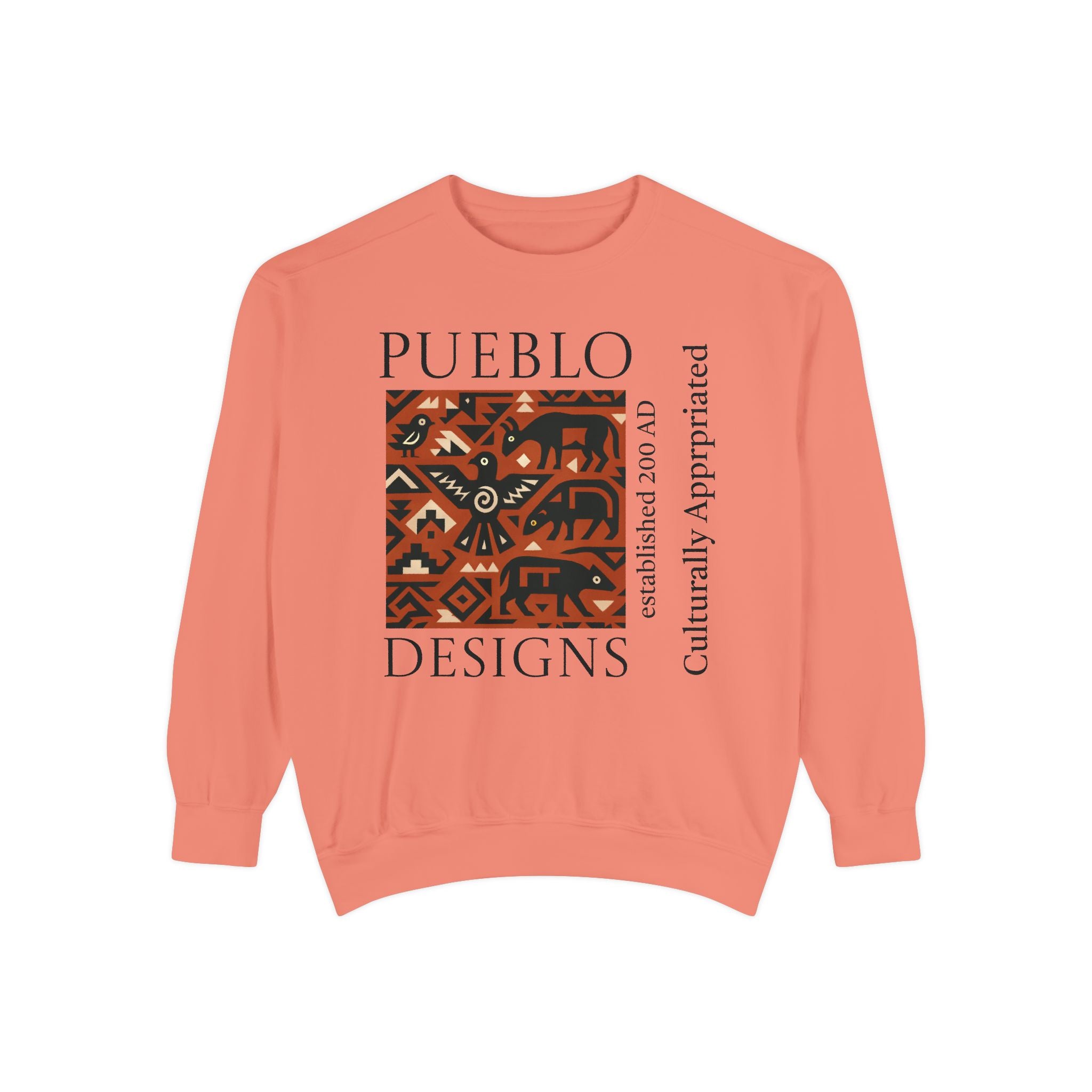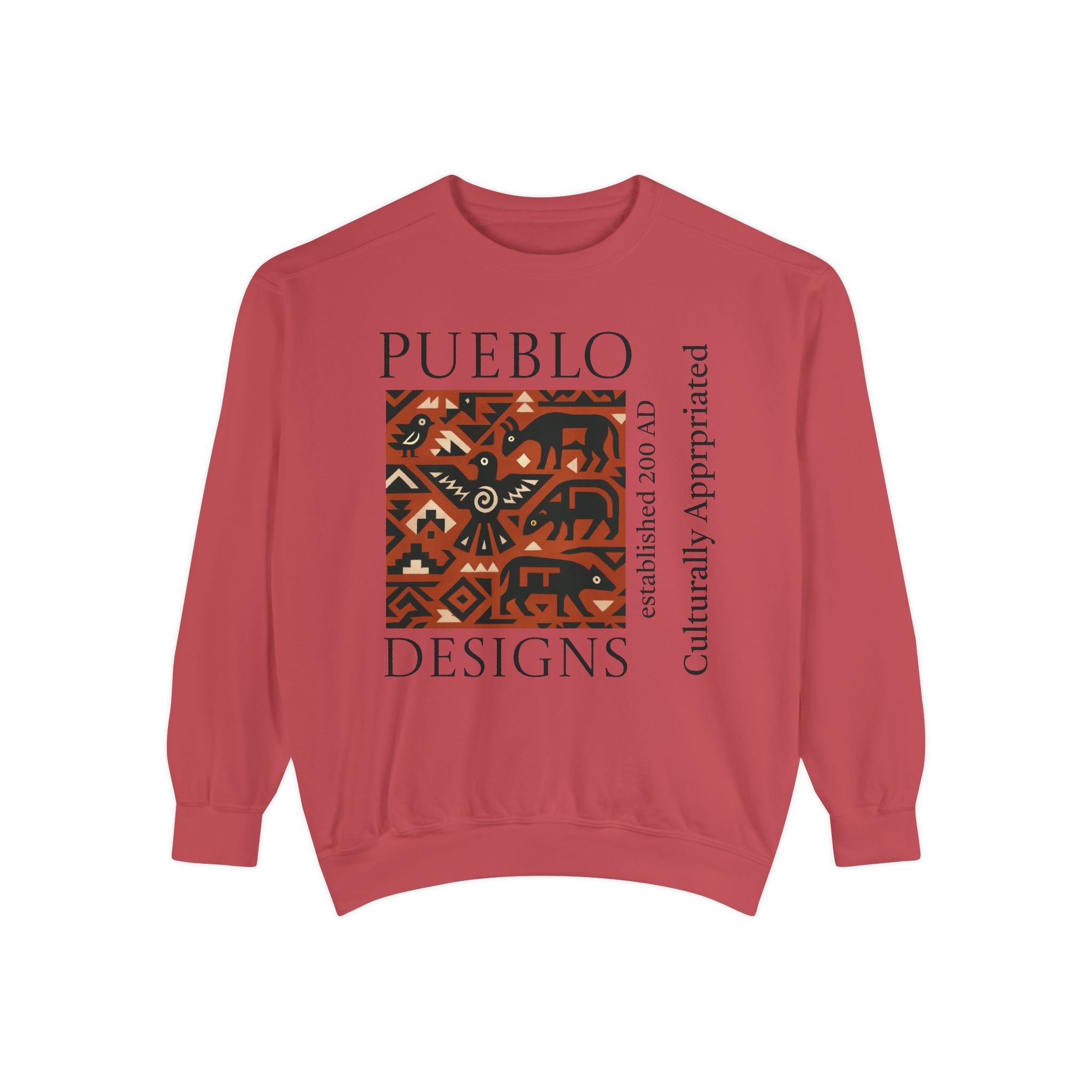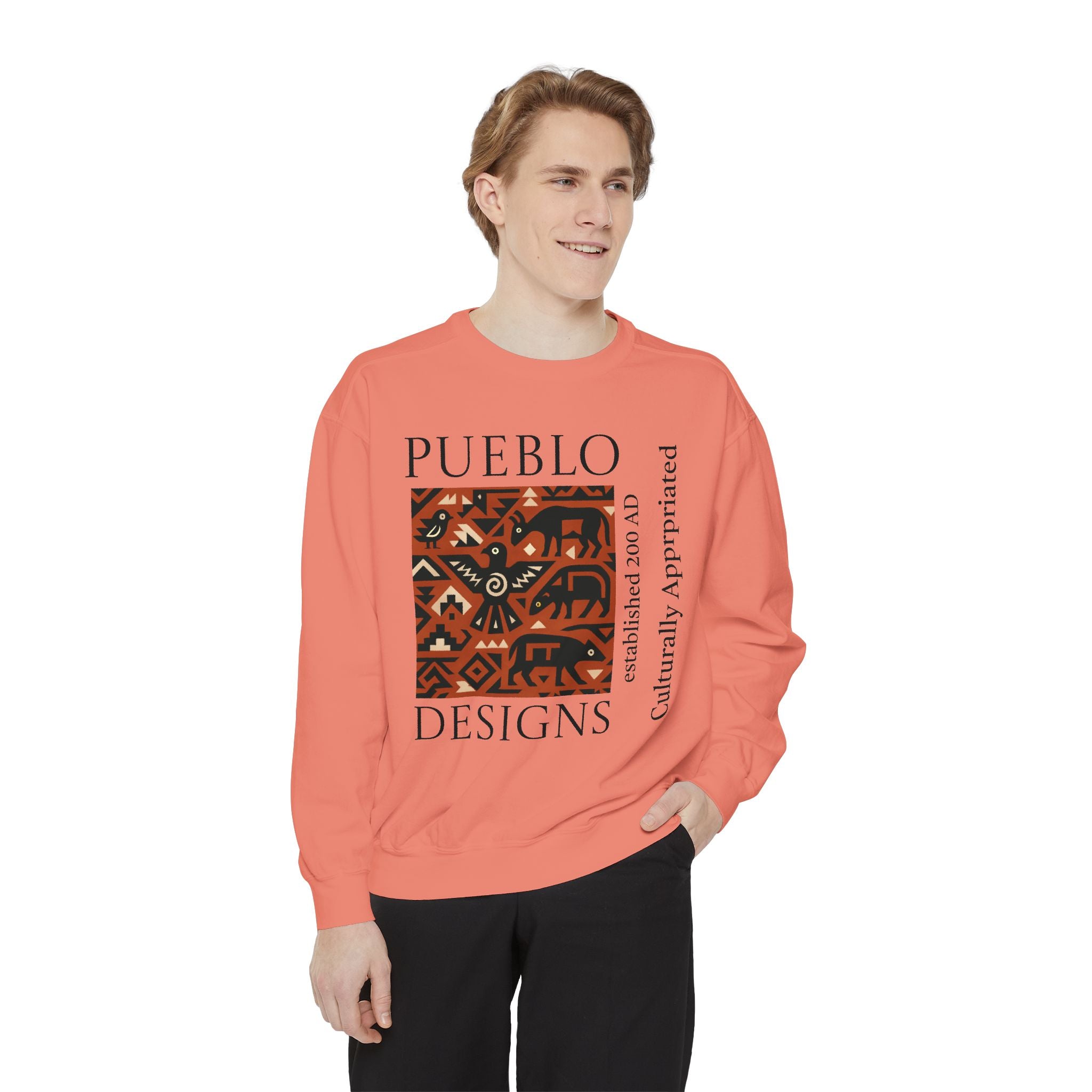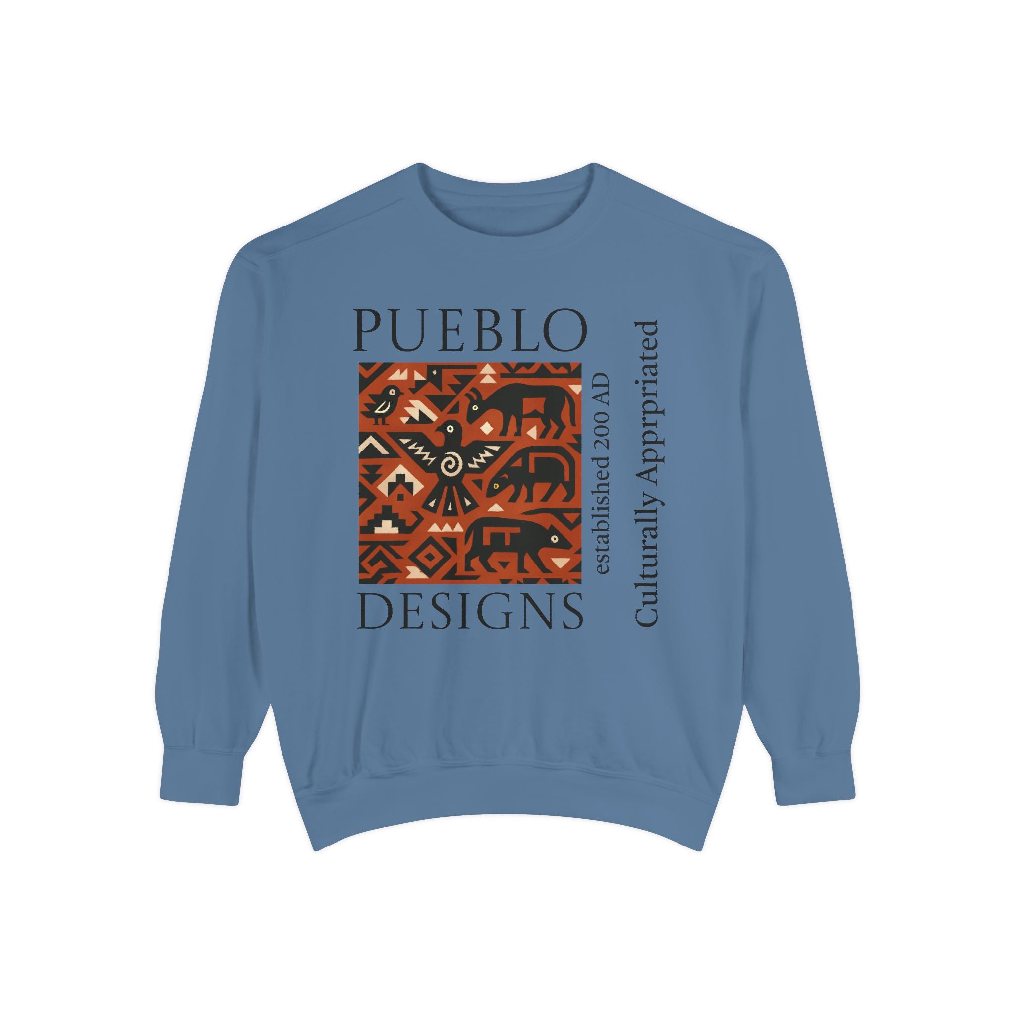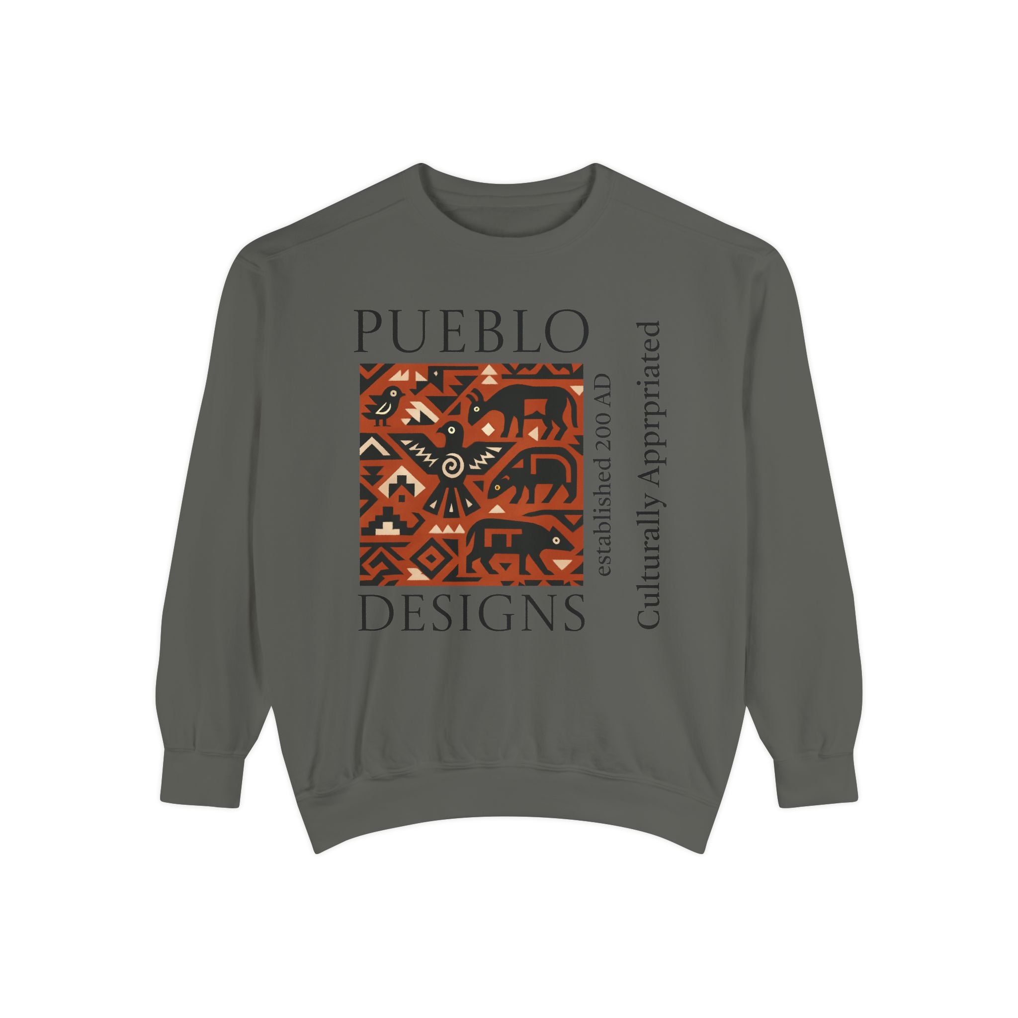 This relaxed-fit sweatshirt brings a grounded, heritage-driven look to everyday wear. A warm, geometric panel—echoing Pueblo textile motifs and animal figures—anchors the chest, while bold vertical lettering adds an editorial edge. The garment-dyed fabric feels soft and substantial, with ribbed collar, cuffs and hem that hold shape and a half-moon back patch for subtle structure. Wear it layered over a tee on cool mornings or as a cozy statement piece on weekend outings; it reads like a quiet nod to tradition with modern street-ready proportions. Product features - 80% ring-spun cotton / 20% polyester — soft, durable medium-heavy fabric (9.5 oz/yd²). - Relaxed fit with 1x1 ribbed collar, cuffs and bottom hem for stretch-and-recovery. - Twill neck tape and half-moon back patch for added stability and comfort. - Embroidery-capable print areas at left or center chest (decoration option). - OEKO-TEX certified low-impact dyes; sewn-in twill label; adult sizing; blanks sourced from Honduras/El Salvador. Care instructions - Machine wash: cold (max 30C or 90F) - Non-chlorine: bleach as needed - Tumble dry: low heat - Do not iron - Do not dryclean
