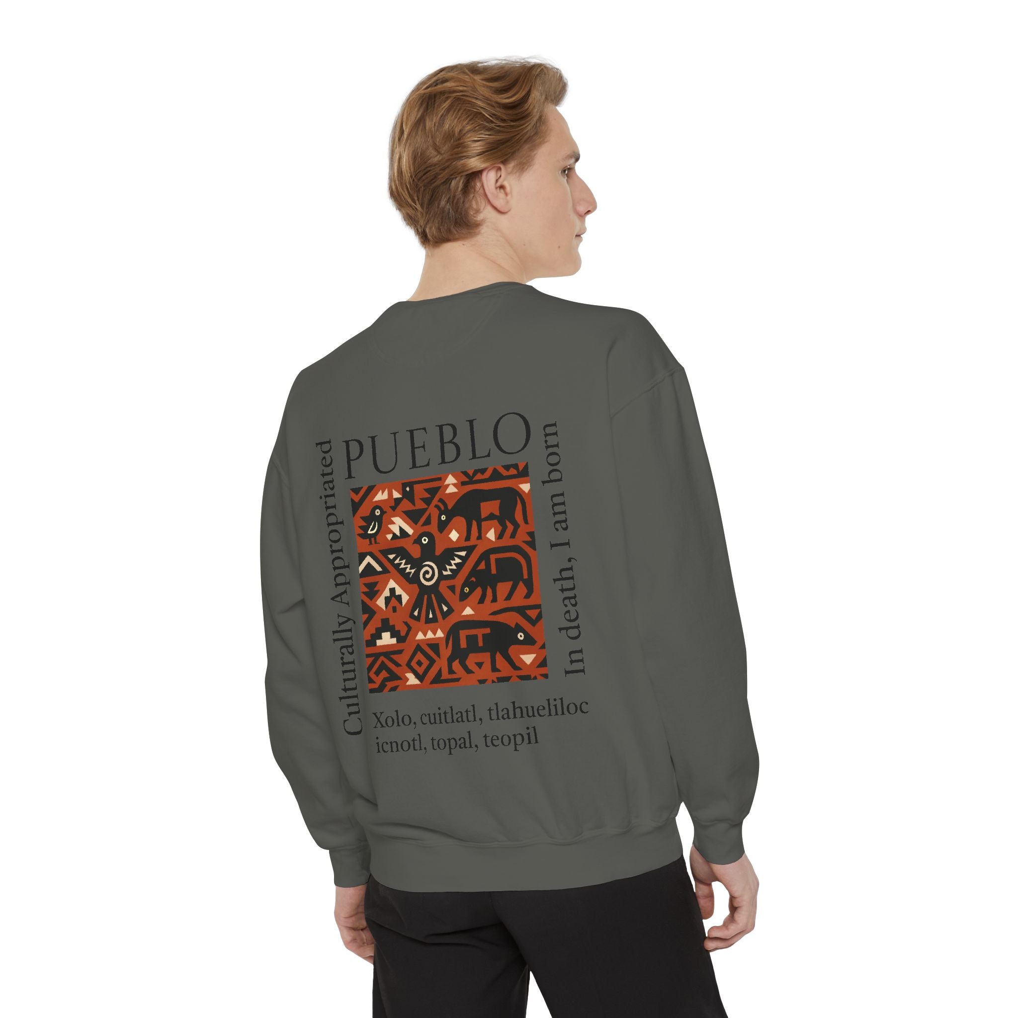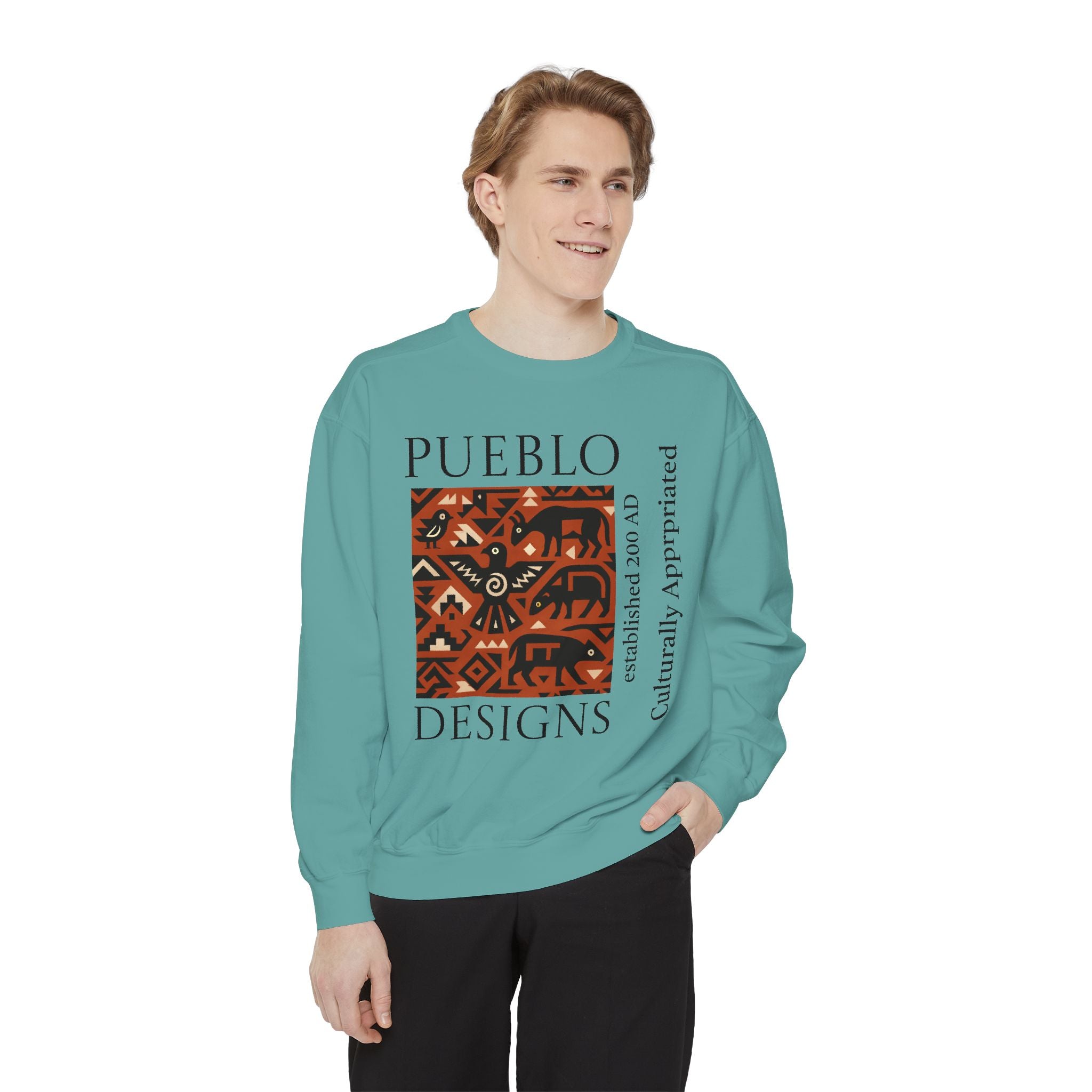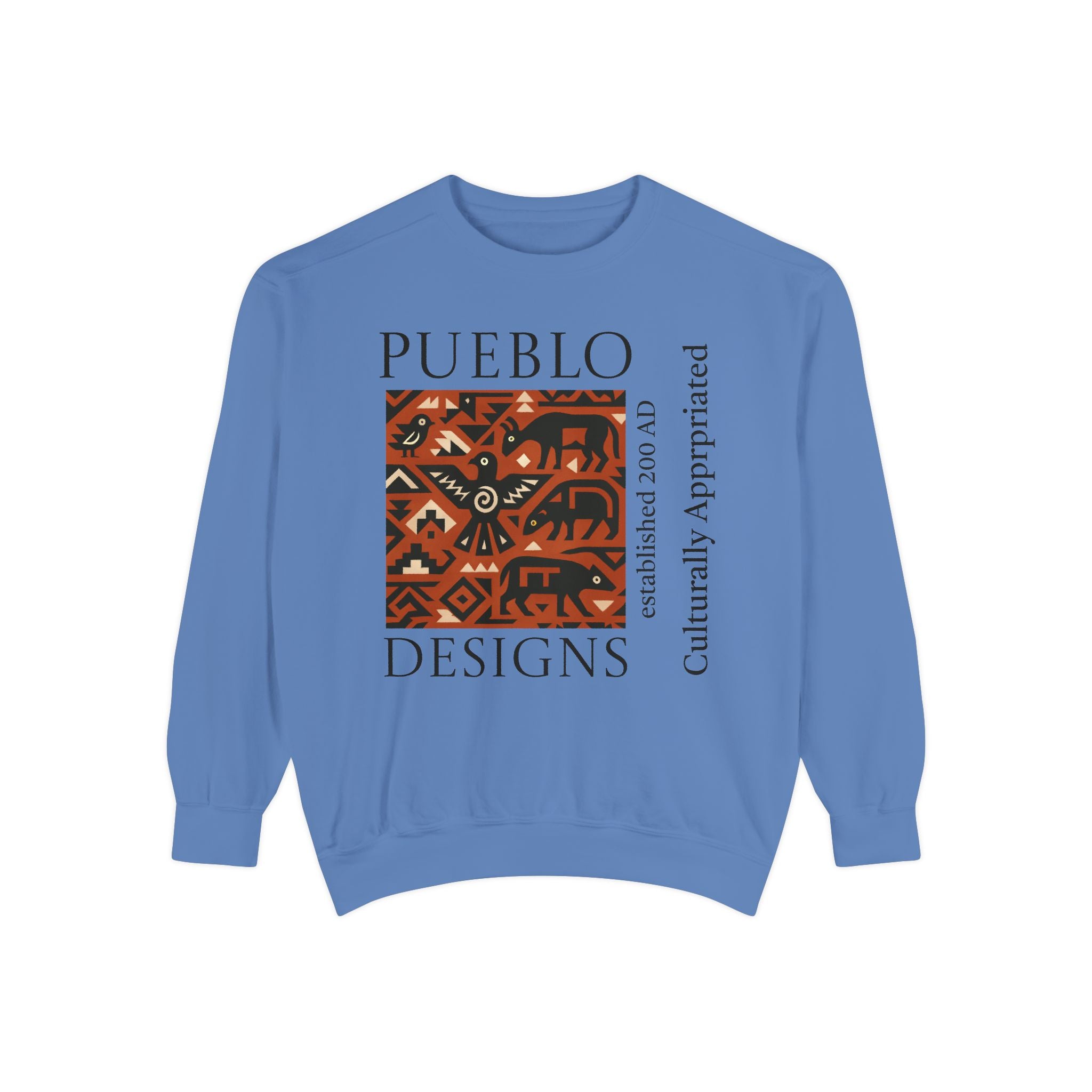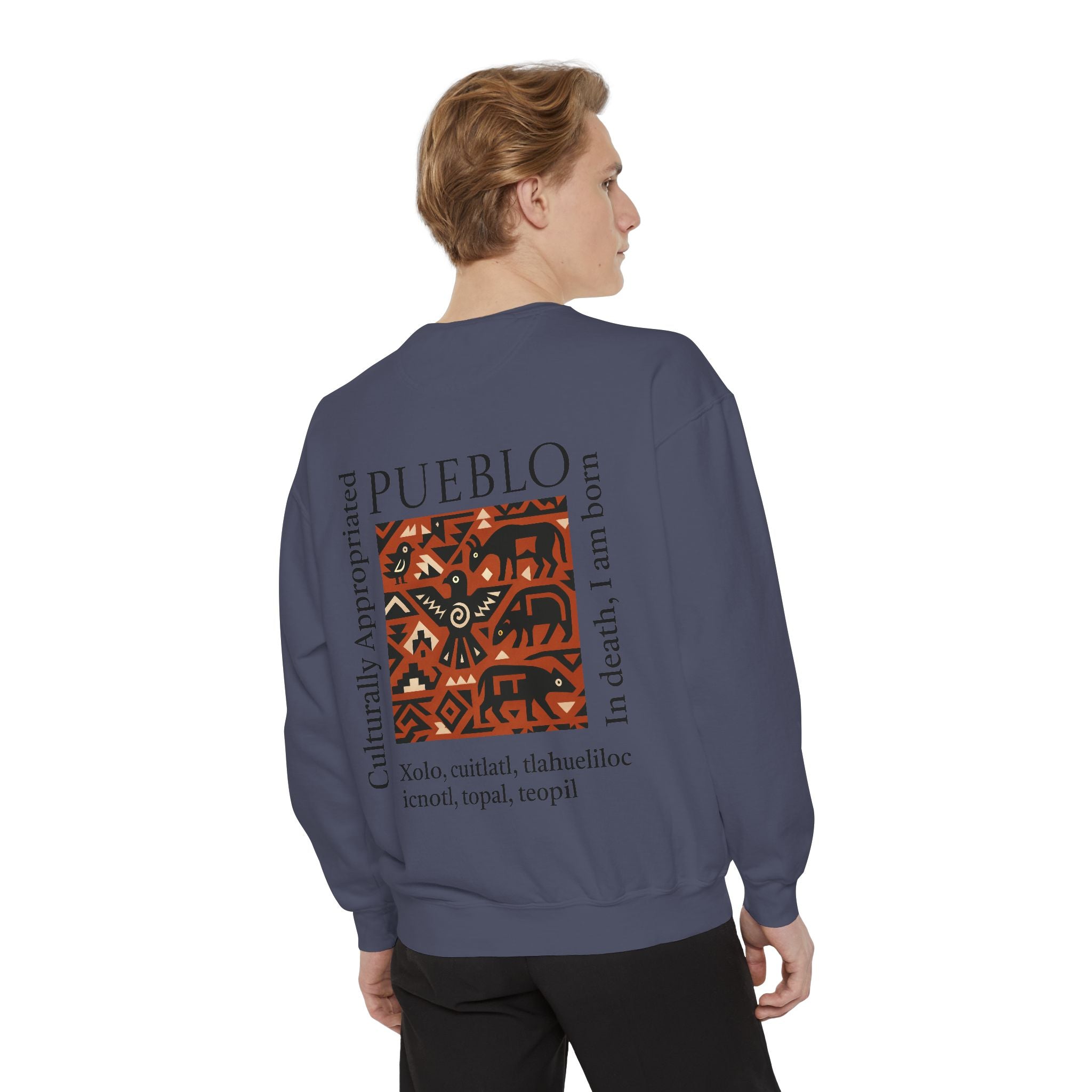 This relaxed-fit sweatshirt brings a grounded, heritage-driven look to everyday wear. A warm, geometric panel—echoing Pueblo textile motifs and animal figures—anchors the chest, while bold vertical lettering adds an editorial edge. The garment-dyed fabric feels soft and substantial, with ribbed collar, cuffs and hem that hold shape and a half-moon back patch for subtle structure. Wear it layered over a tee on cool mornings or as a cozy statement piece on weekend outings; it reads like a quiet nod to tradition with modern street-ready proportions. Product features - 80% ring-spun cotton / 20% polyester — soft, durable medium-heavy fabric (9.5 oz/yd²). - Relaxed fit with 1x1 ribbed collar, cuffs and bottom hem for stretch-and-recovery. - Twill neck tape and half-moon back patch for added stability and comfort. - Embroidery-capable print areas at left or center chest (decoration option). - OEKO-TEX certified low-impact dyes; sewn-in twill label; adult sizing; blanks sourced from Honduras/El Salvador. Care instructions - Machine wash: cold (max 30C or 90F) - Non-chlorine: bleach as needed - Tumble dry: low heat - Do not iron - Do not dryclean