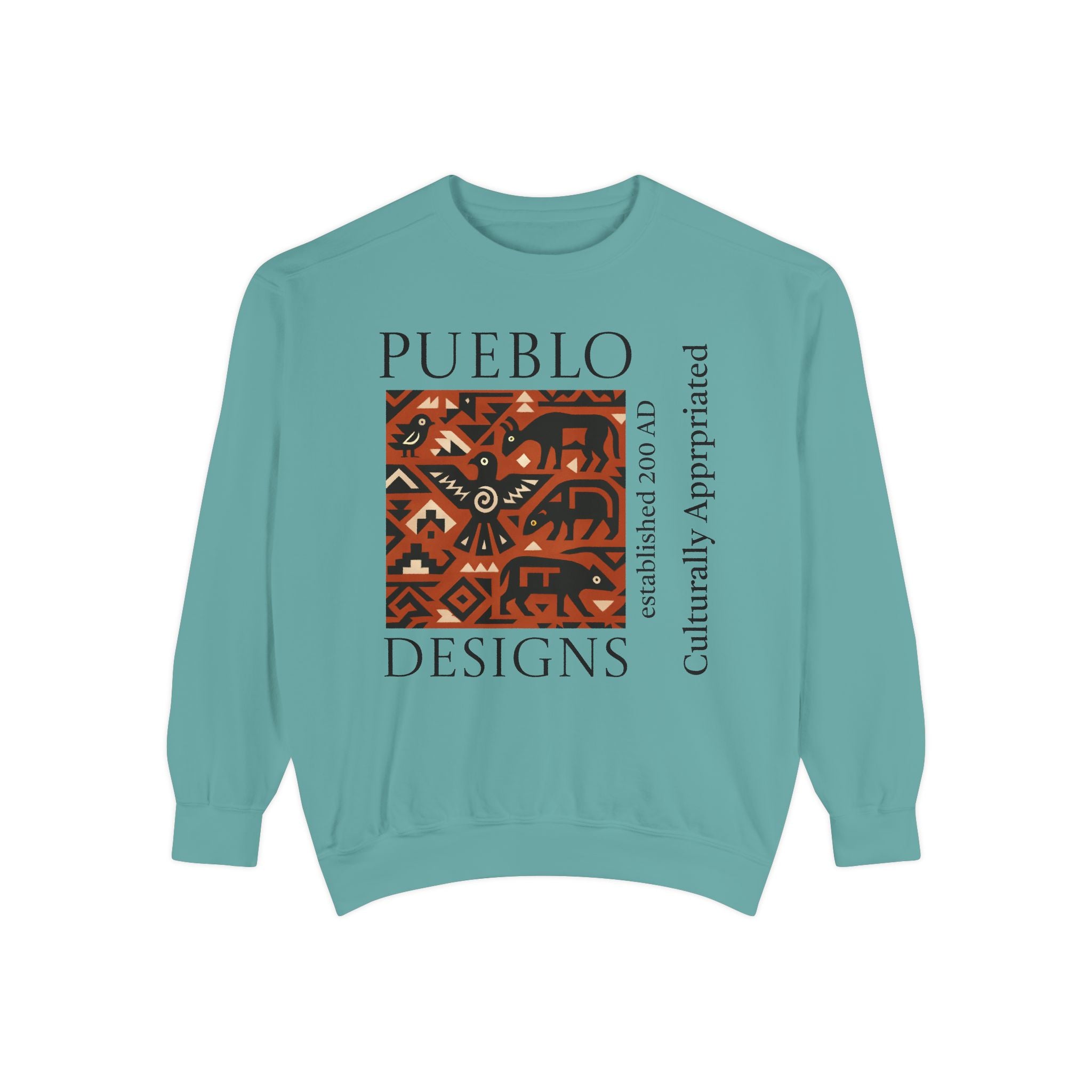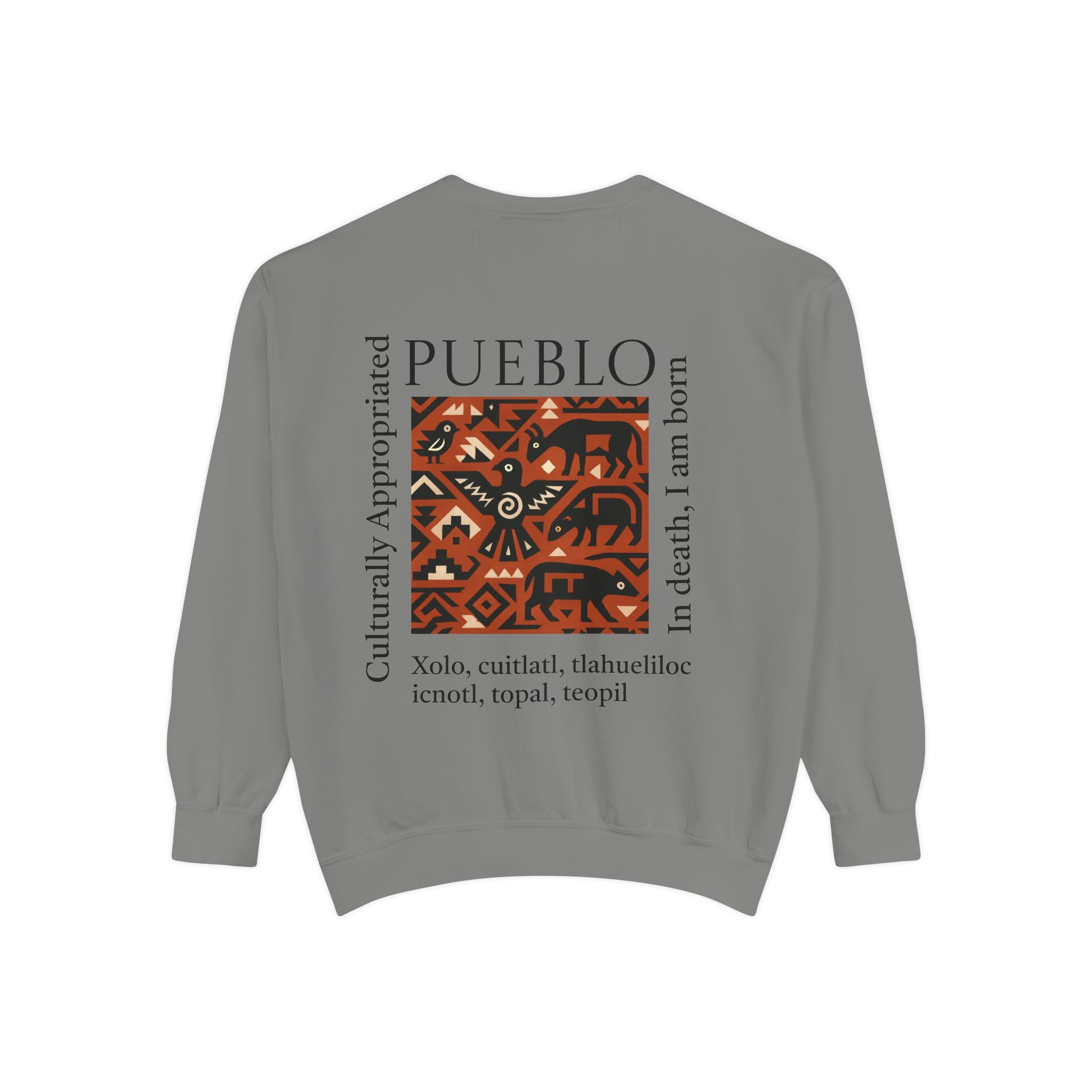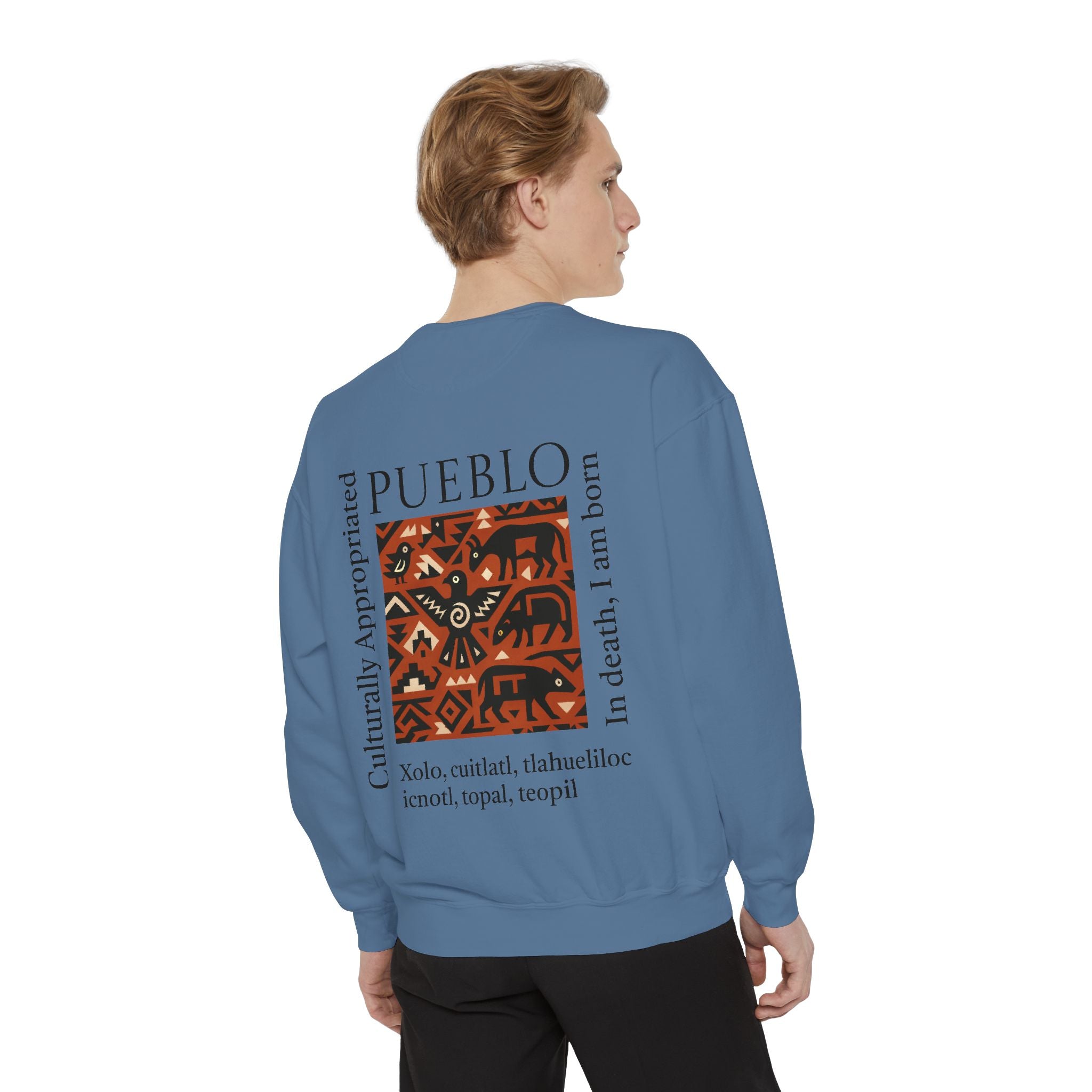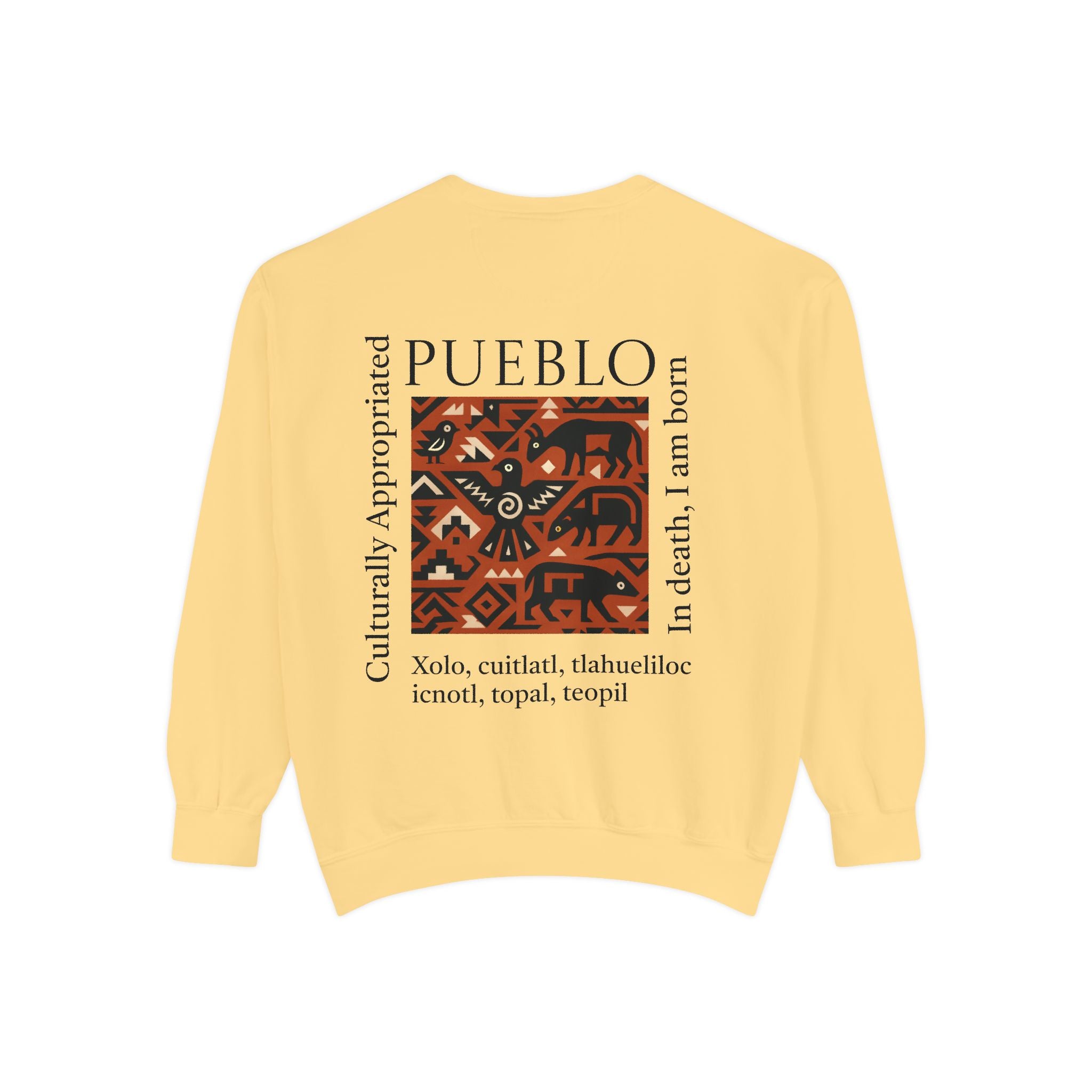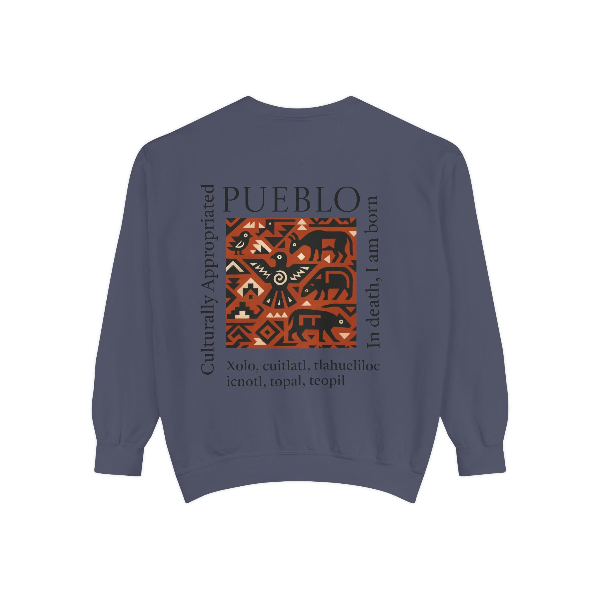 This relaxed-fit sweatshirt brings a grounded, heritage-driven look to everyday wear. A warm, geometric panel—echoing Pueblo textile motifs and animal figures—anchors the chest, while bold vertical lettering adds an editorial edge. The garment-dyed fabric feels soft and substantial, with ribbed collar, cuffs and hem that hold shape and a half-moon back patch for subtle structure. Wear it layered over a tee on cool mornings or as a cozy statement piece on weekend outings; it reads like a quiet nod to tradition with modern street-ready proportions. Product features - 80% ring-spun cotton / 20% polyester — soft, durable medium-heavy fabric (9.5 oz/yd²). - Relaxed fit with 1x1 ribbed collar, cuffs and bottom hem for stretch-and-recovery. - Twill neck tape and half-moon back patch for added stability and comfort. - Embroidery-capable print areas at left or center chest (decoration option). - OEKO-TEX certified low-impact dyes; sewn-in twill label; adult sizing; blanks sourced from Honduras/El Salvador. Care instructions - Machine wash: cold (max 30C or 90F) - Non-chlorine: bleach as needed - Tumble dry: low heat - Do not iron - Do not dryclean