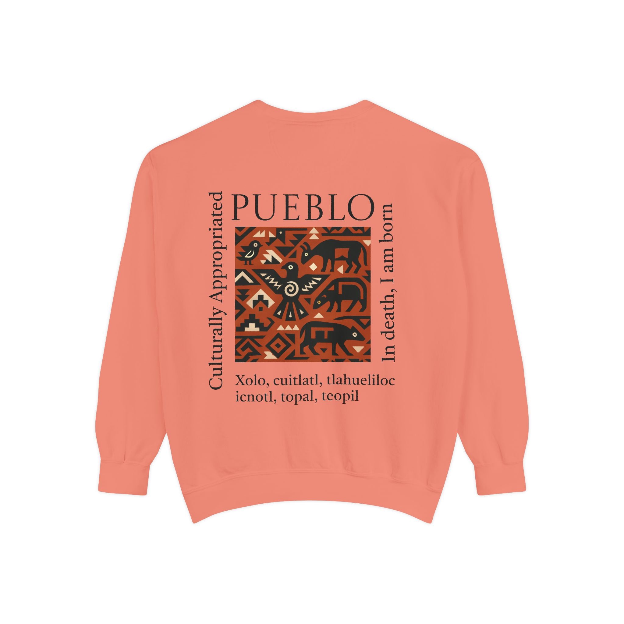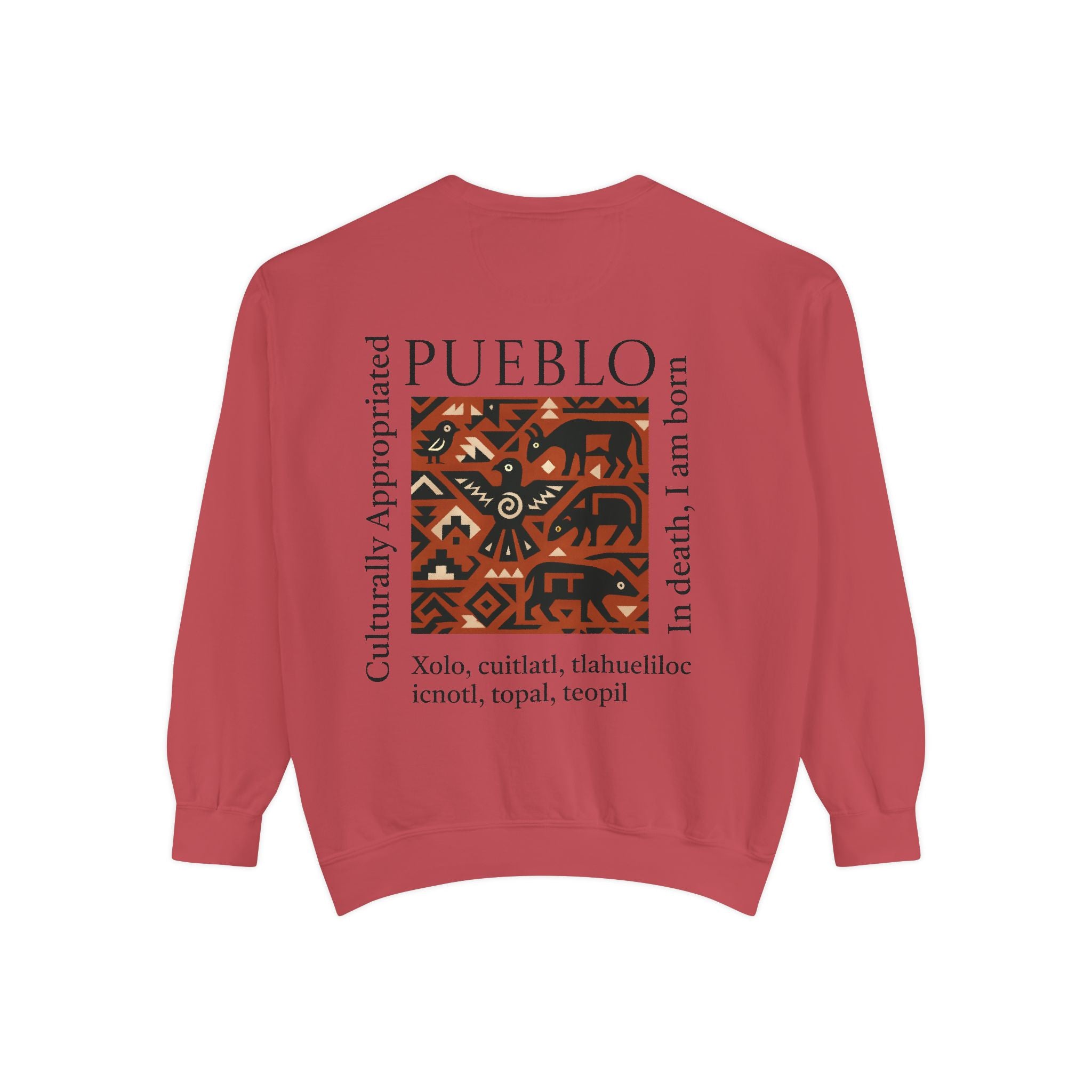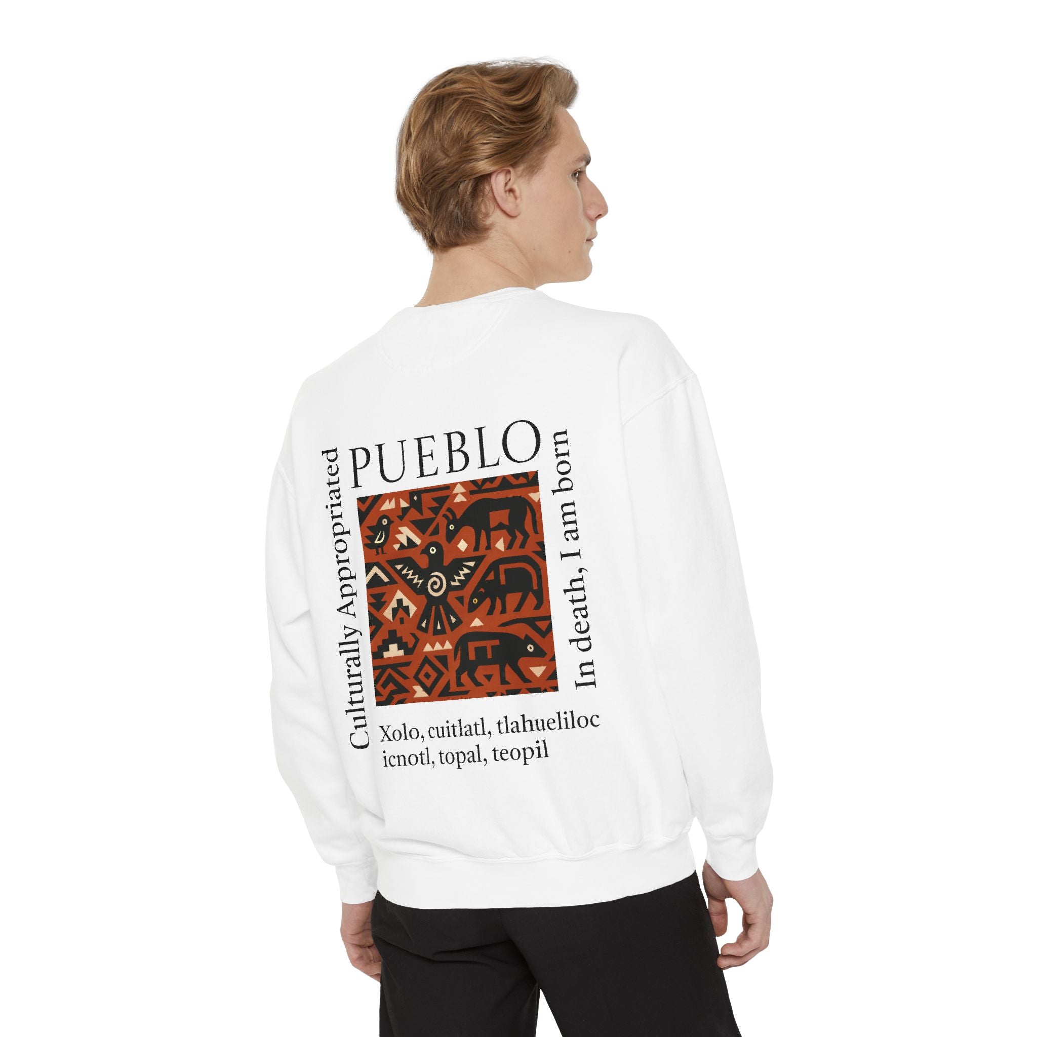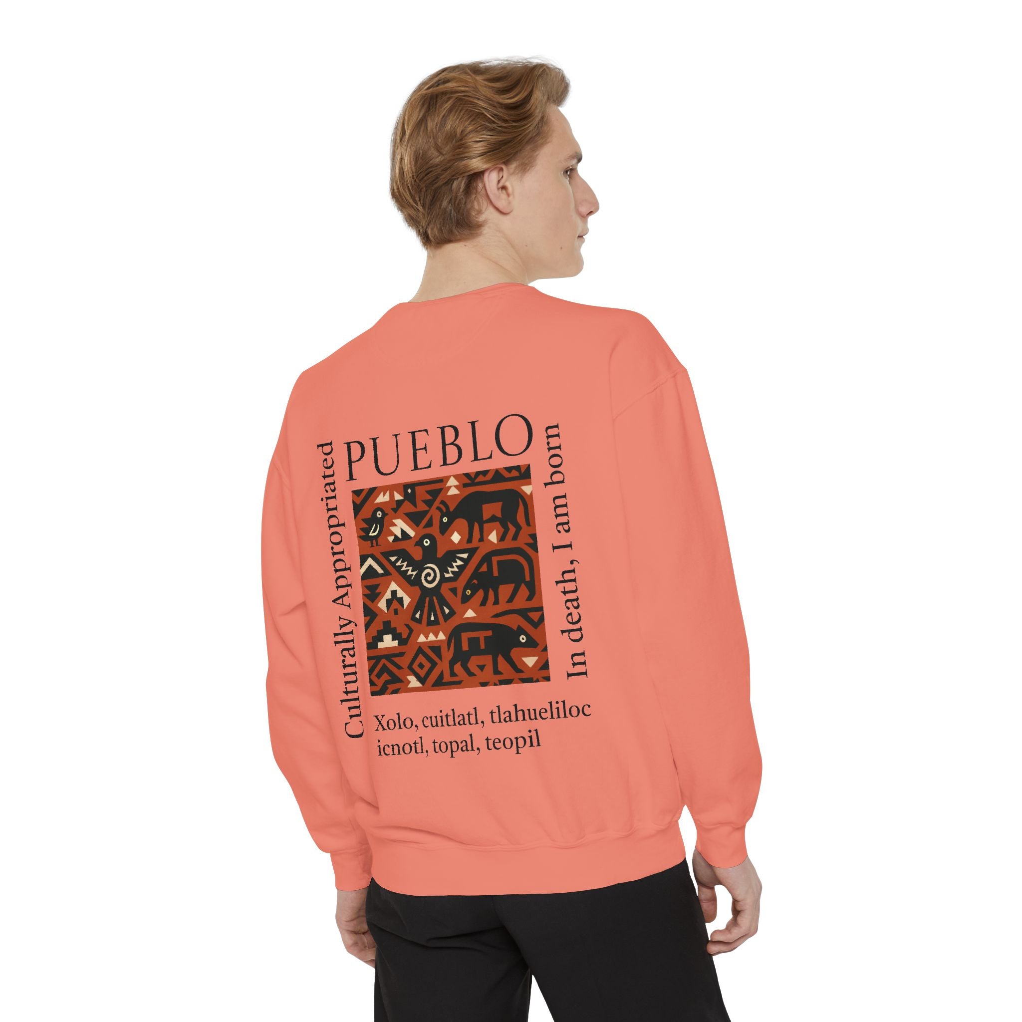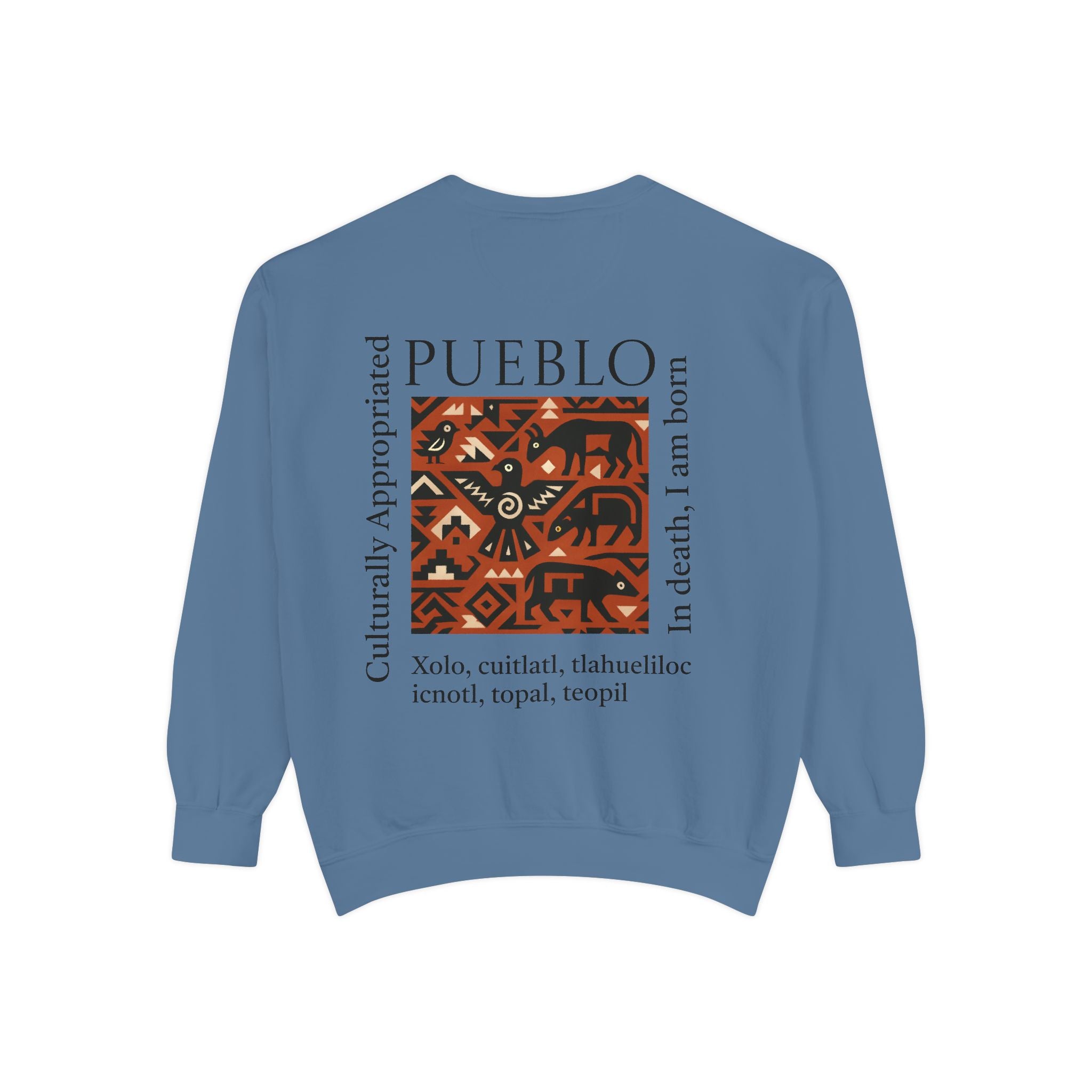 This relaxed-fit sweatshirt brings a grounded, heritage-driven look to everyday wear. A warm, geometric panel—echoing Pueblo textile motifs and animal figures—anchors the chest, while bold vertical lettering adds an editorial edge. The garment-dyed fabric feels soft and substantial, with ribbed collar, cuffs and hem that hold shape and a half-moon back patch for subtle structure. Wear it layered over a tee on cool mornings or as a cozy statement piece on weekend outings; it reads like a quiet nod to tradition with modern street-ready proportions. Product features - 80% ring-spun cotton / 20% polyester — soft, durable medium-heavy fabric (9.5 oz/yd²). - Relaxed fit with 1x1 ribbed collar, cuffs and bottom hem for stretch-and-recovery. - Twill neck tape and half-moon back patch for added stability and comfort. - Embroidery-capable print areas at left or center chest (decoration option). - OEKO-TEX certified low-impact dyes; sewn-in twill label; adult sizing; blanks sourced from Honduras/El Salvador. Care instructions - Machine wash: cold (max 30C or 90F) - Non-chlorine: bleach as needed - Tumble dry: low heat - Do not iron - Do not dryclean