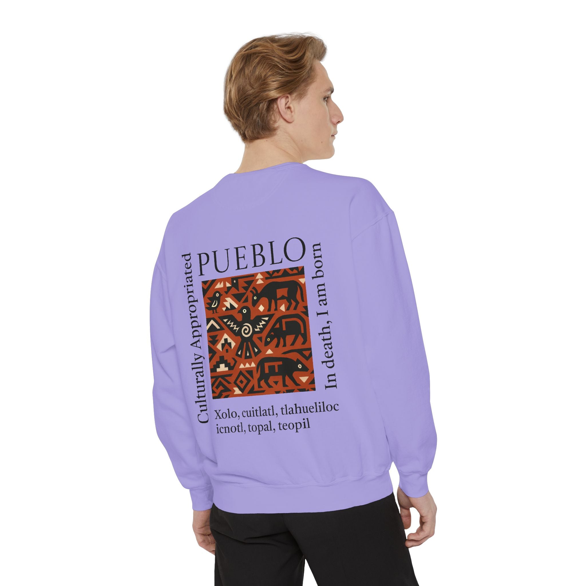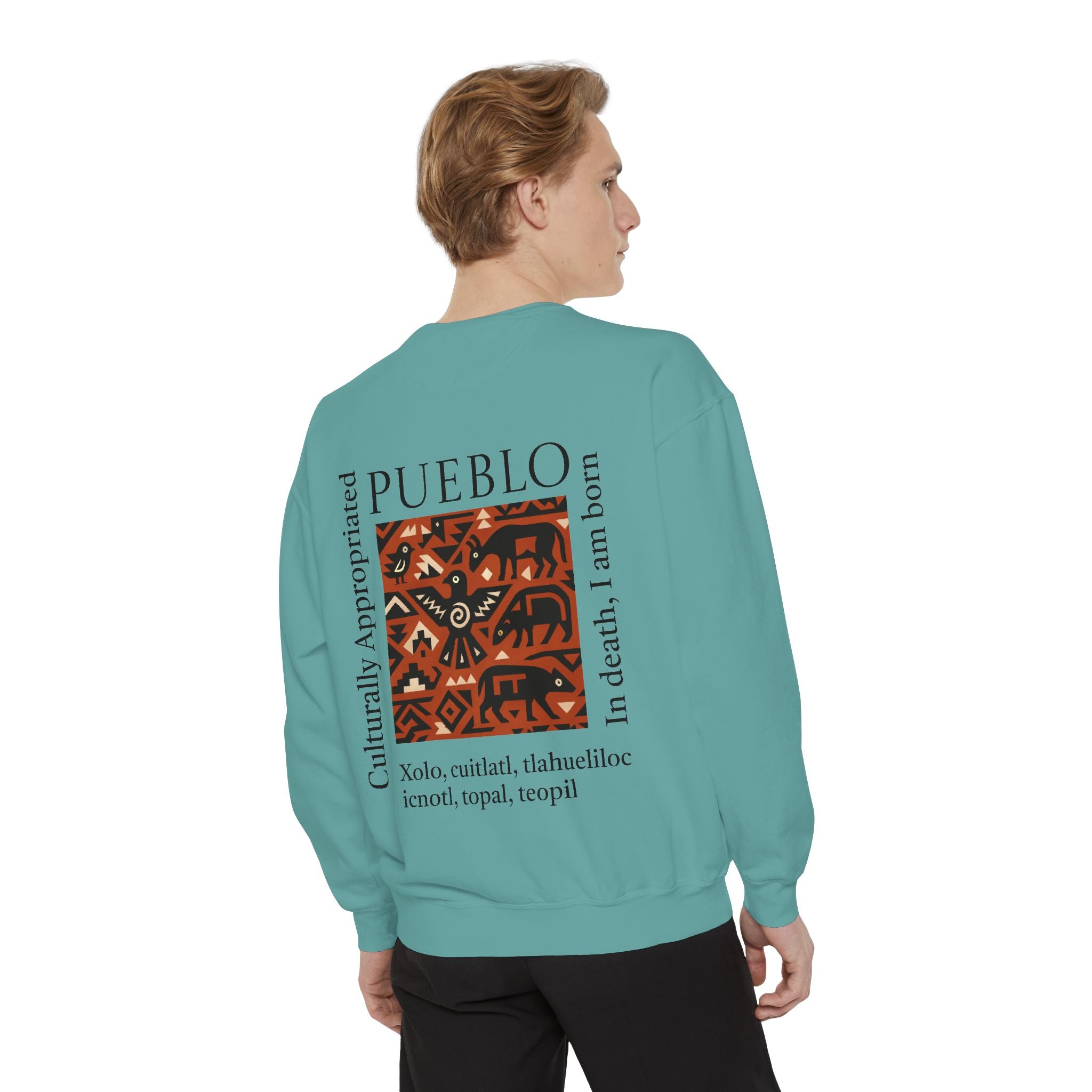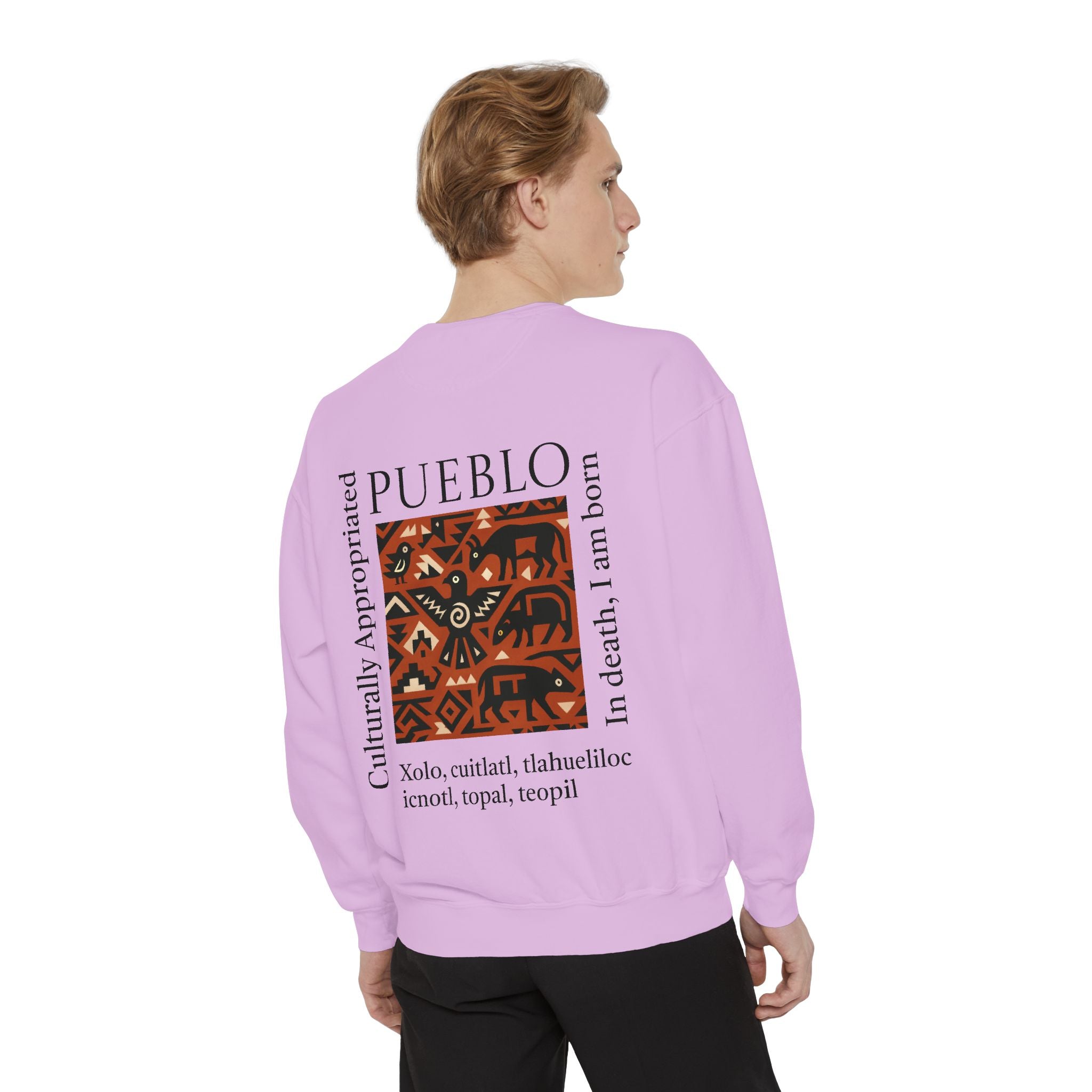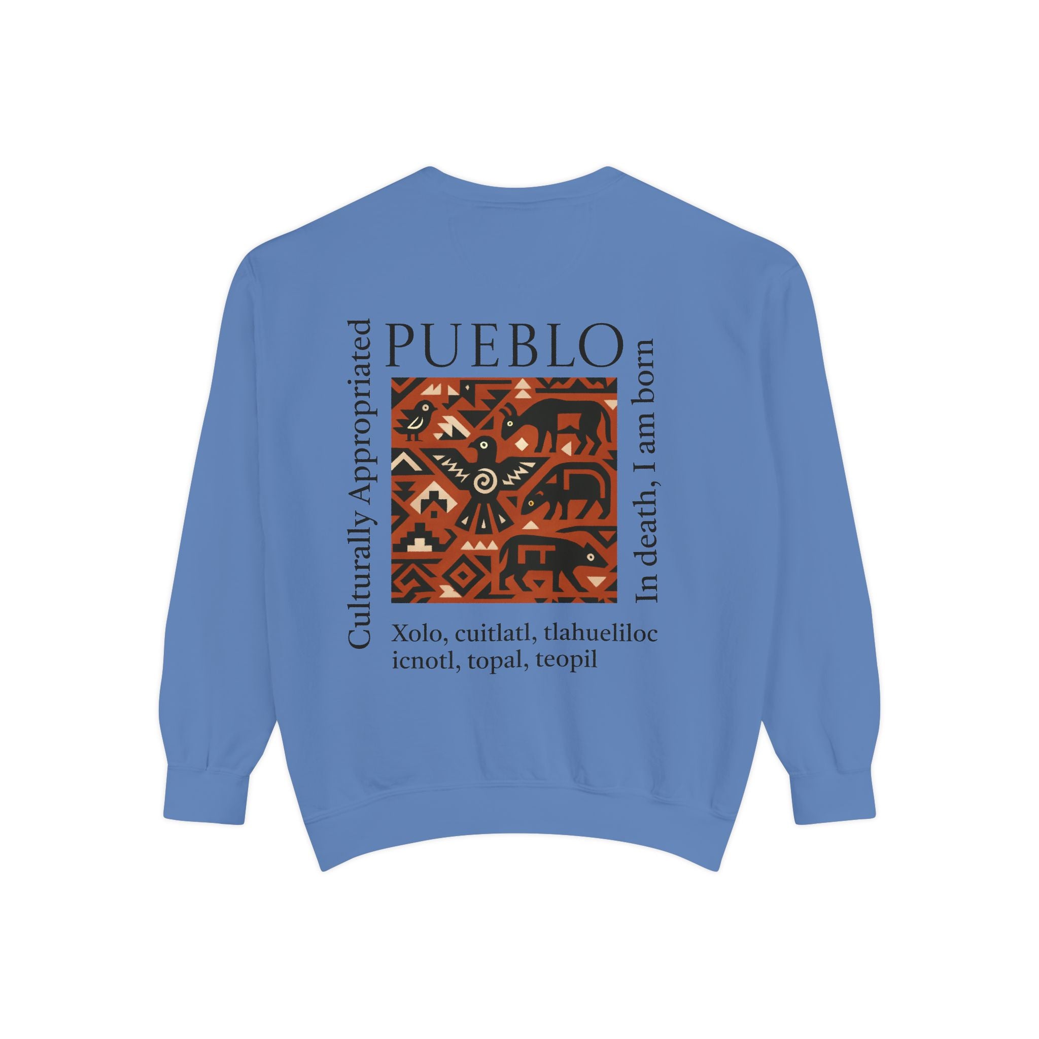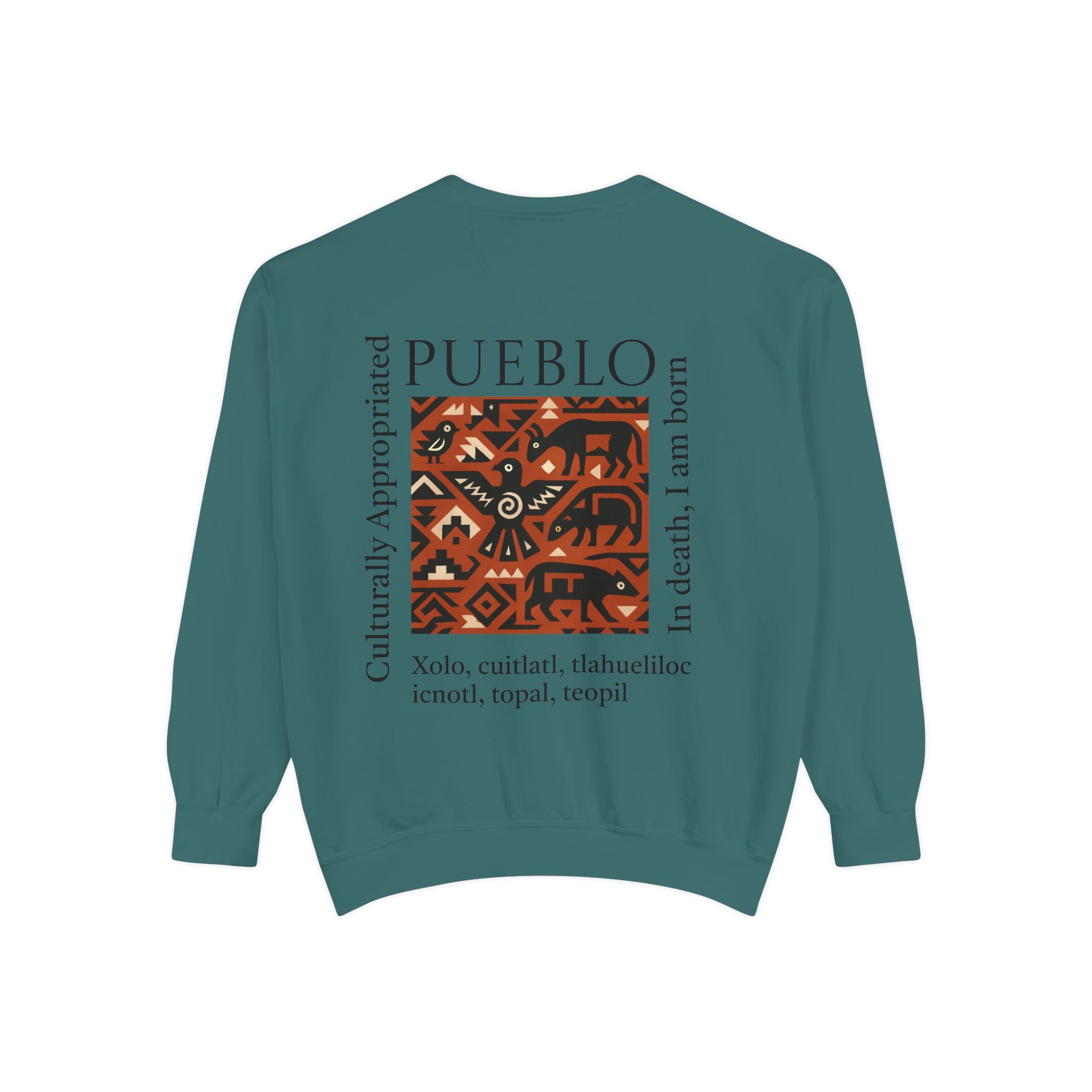 This relaxed-fit sweatshirt brings a grounded, heritage-driven look to everyday wear. A warm, geometric panel—echoing Pueblo textile motifs and animal figures—anchors the chest, while bold vertical lettering adds an editorial edge. The garment-dyed fabric feels soft and substantial, with ribbed collar, cuffs and hem that hold shape and a half-moon back patch for subtle structure. Wear it layered over a tee on cool mornings or as a cozy statement piece on weekend outings; it reads like a quiet nod to tradition with modern street-ready proportions. Product features - 80% ring-spun cotton / 20% polyester — soft, durable medium-heavy fabric (9.5 oz/yd²). - Relaxed fit with 1x1 ribbed collar, cuffs and bottom hem for stretch-and-recovery. - Twill neck tape and half-moon back patch for added stability and comfort. - Embroidery-capable print areas at left or center chest (decoration option). - OEKO-TEX certified low-impact dyes; sewn-in twill label; adult sizing; blanks sourced from Honduras/El Salvador. Care instructions - Machine wash: cold (max 30C or 90F) - Non-chlorine: bleach as needed - Tumble dry: low heat - Do not iron - Do not dryclean