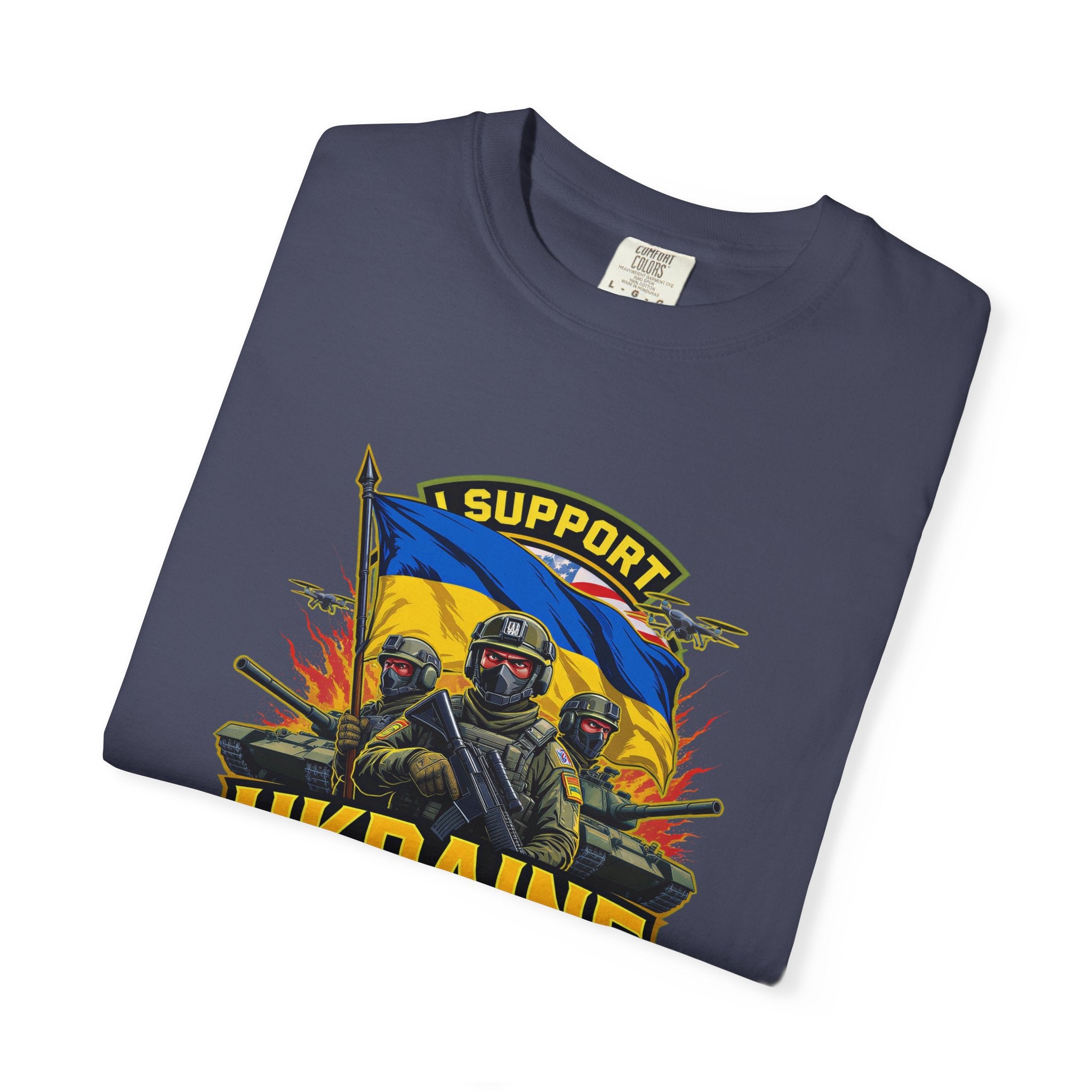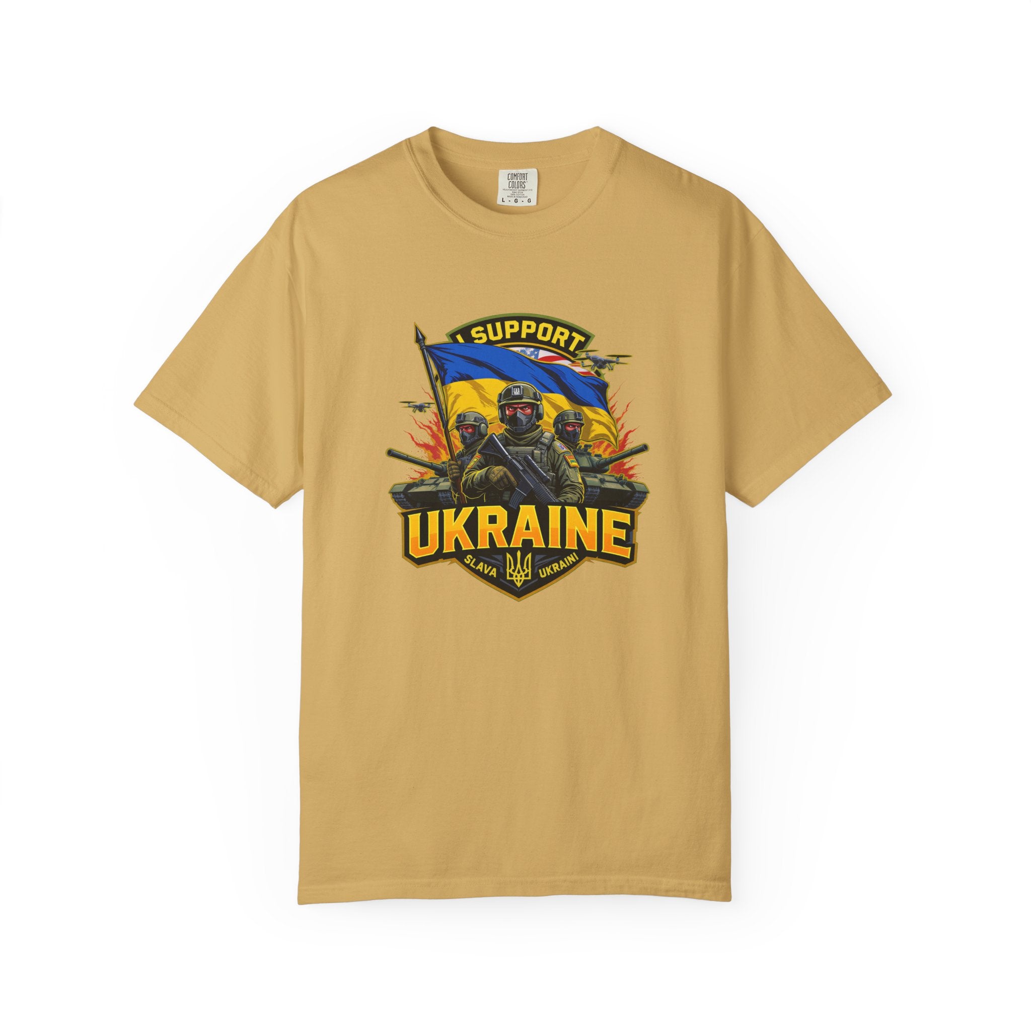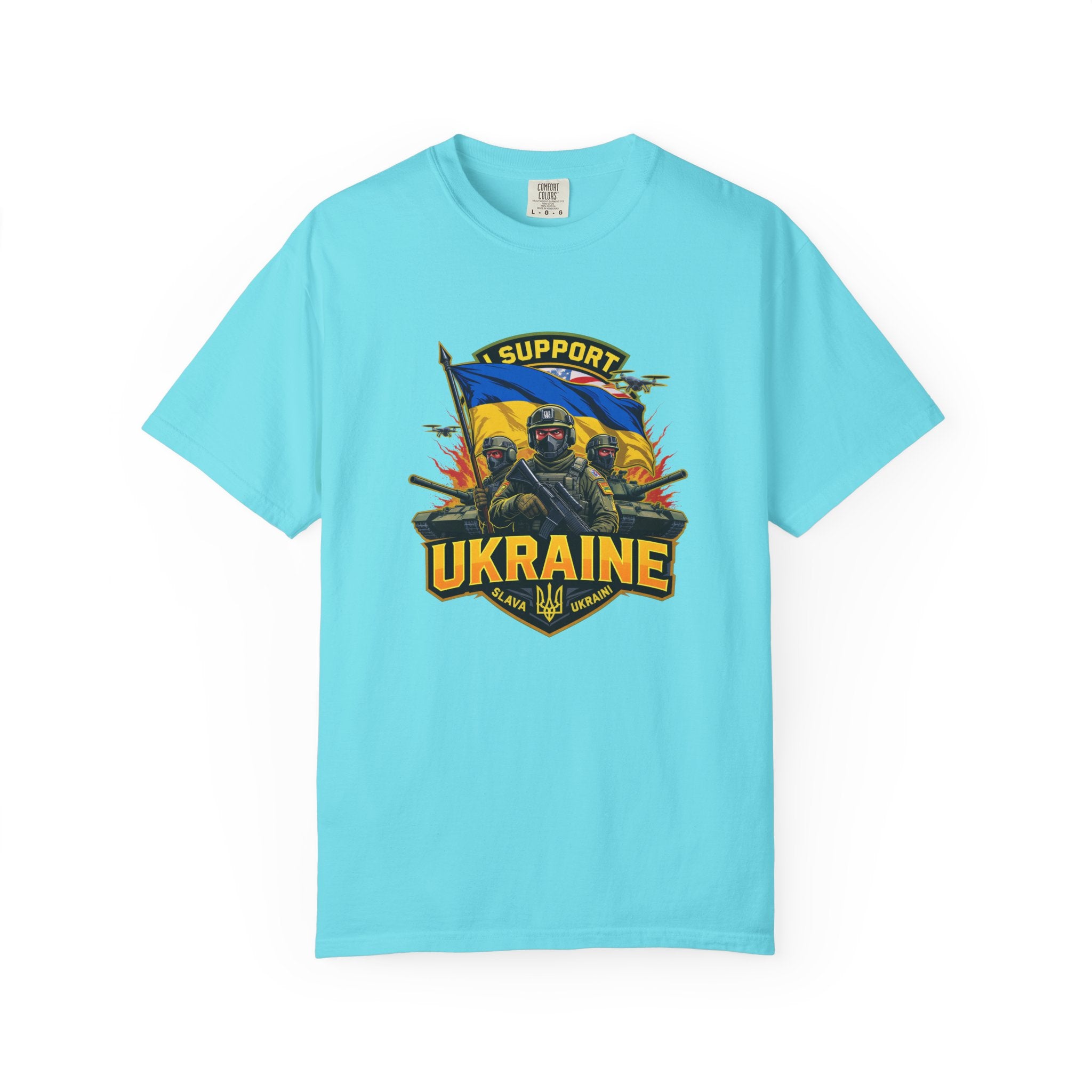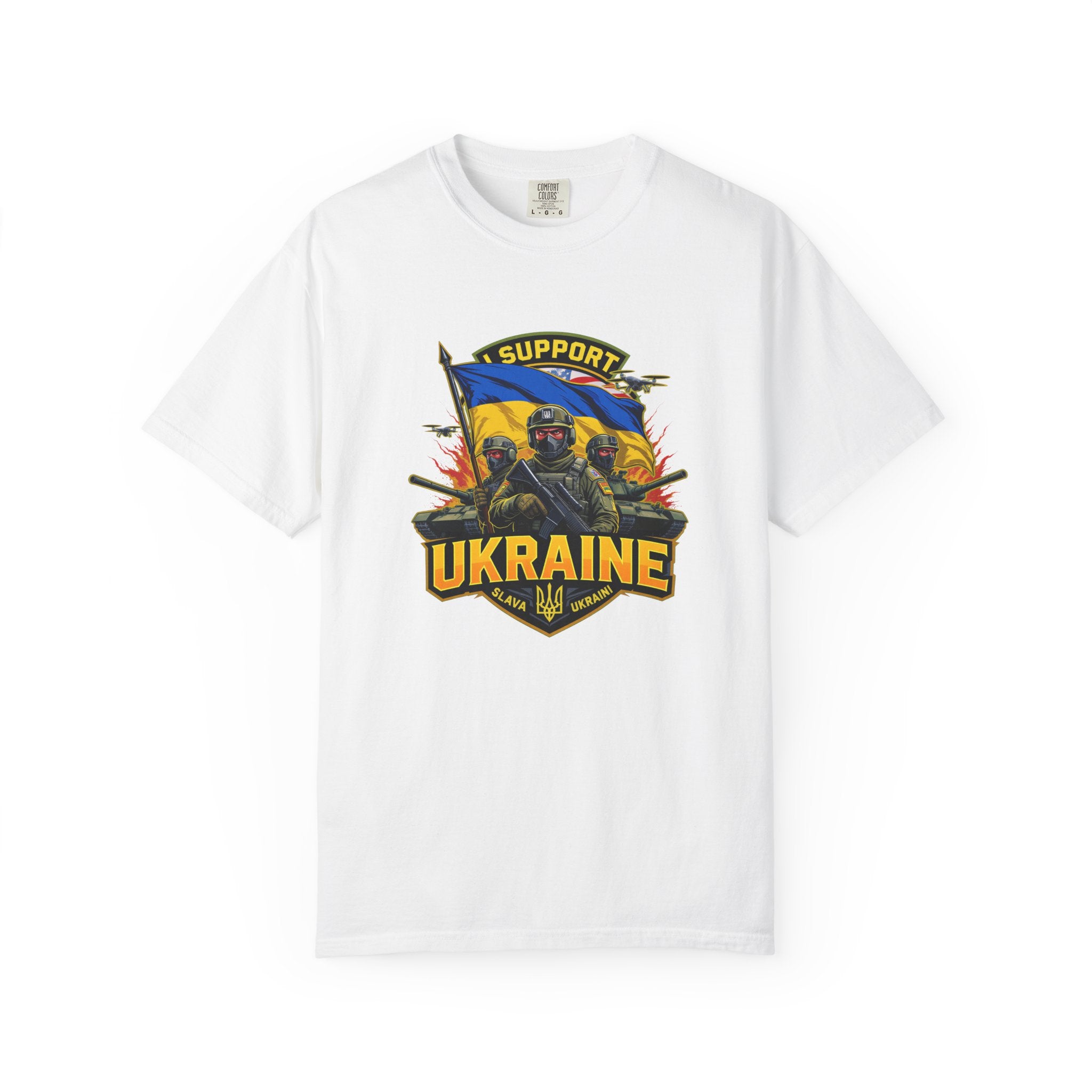 Embrace comfort and style with this 'I Support Ukraine!' Cart, dyed t-shirt. Crafted from 100% ring-spun US cotton, it offers...
