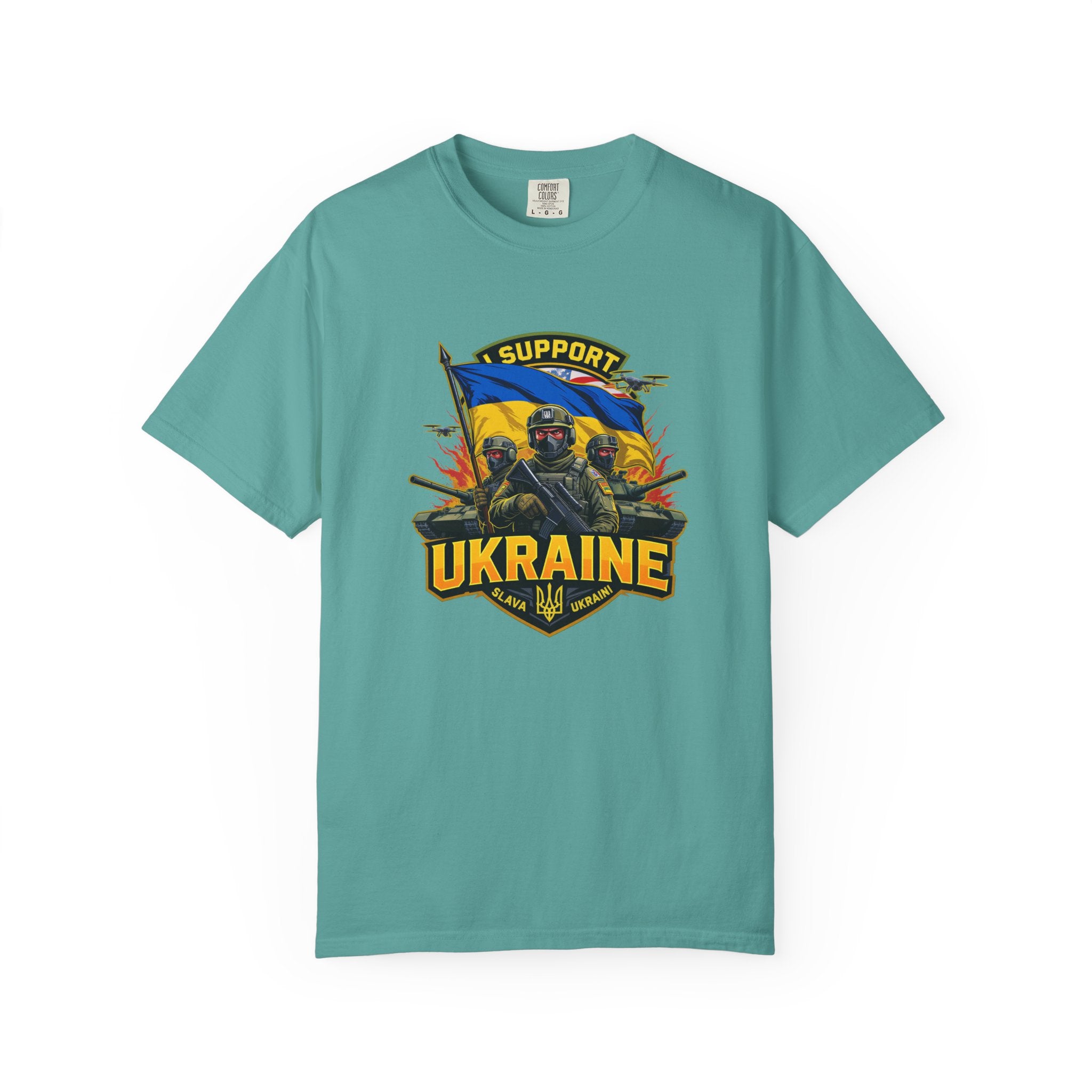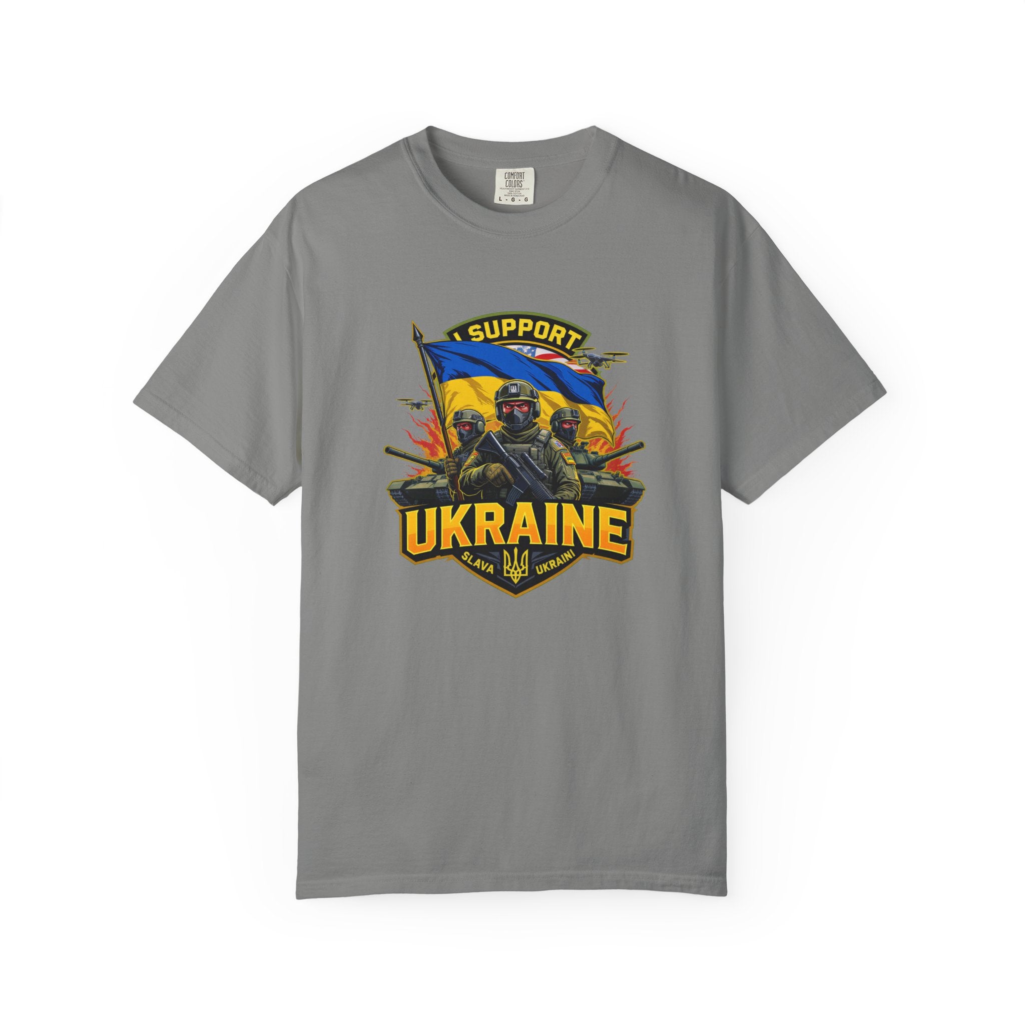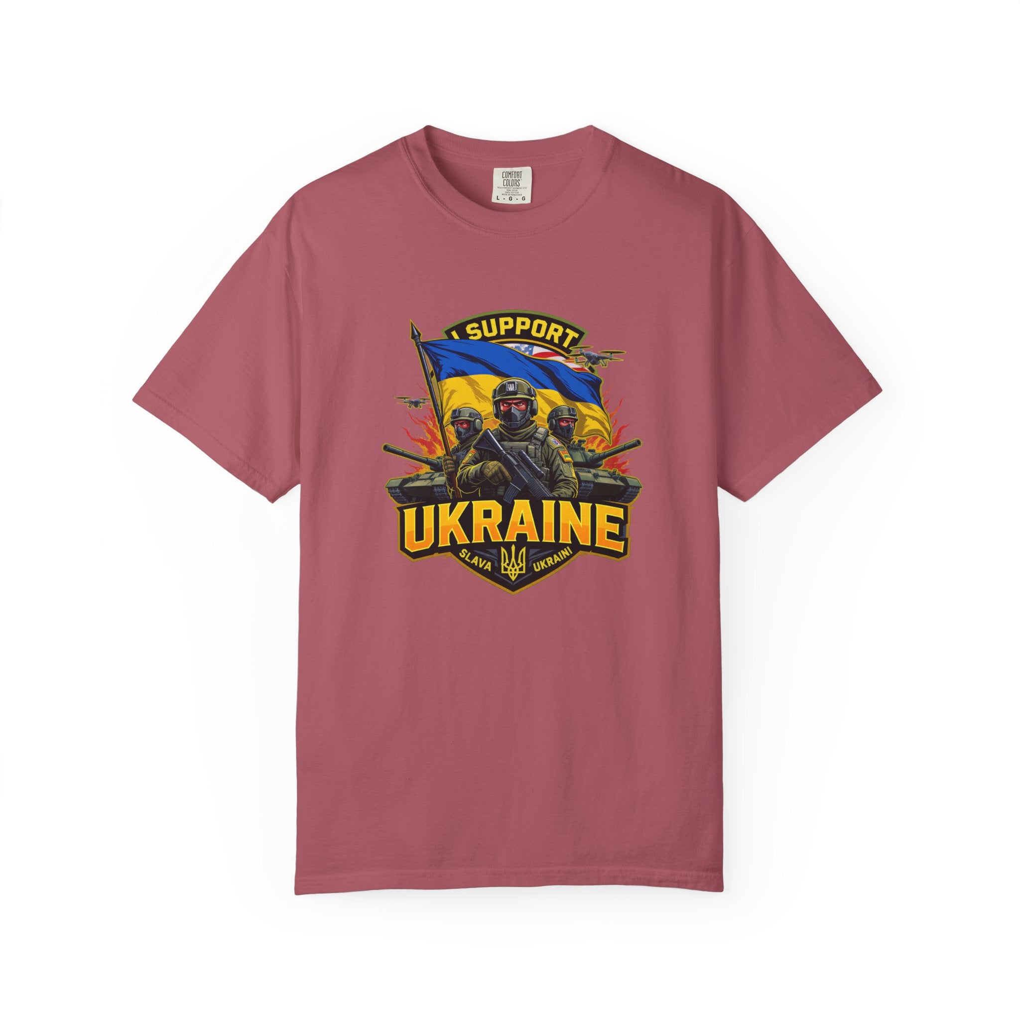 Embrace comfort and style with this 'I Support Ukraine!' Cart, dyed t-shirt. Crafted from 100% ring-spun US cotton, it offers...