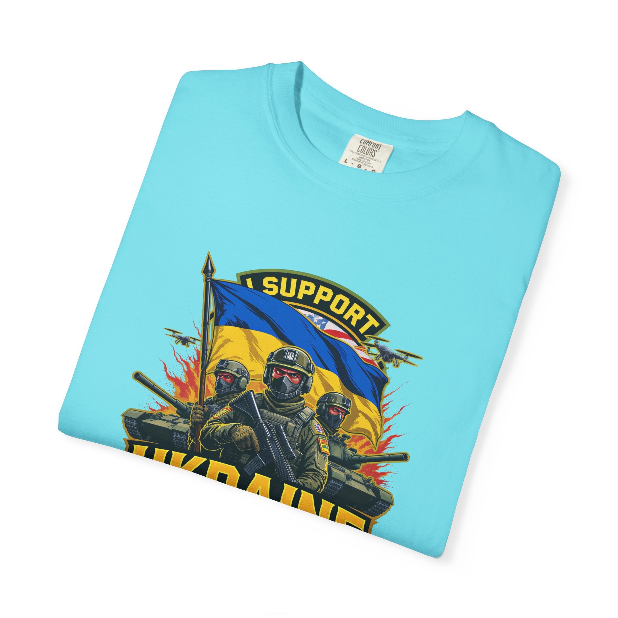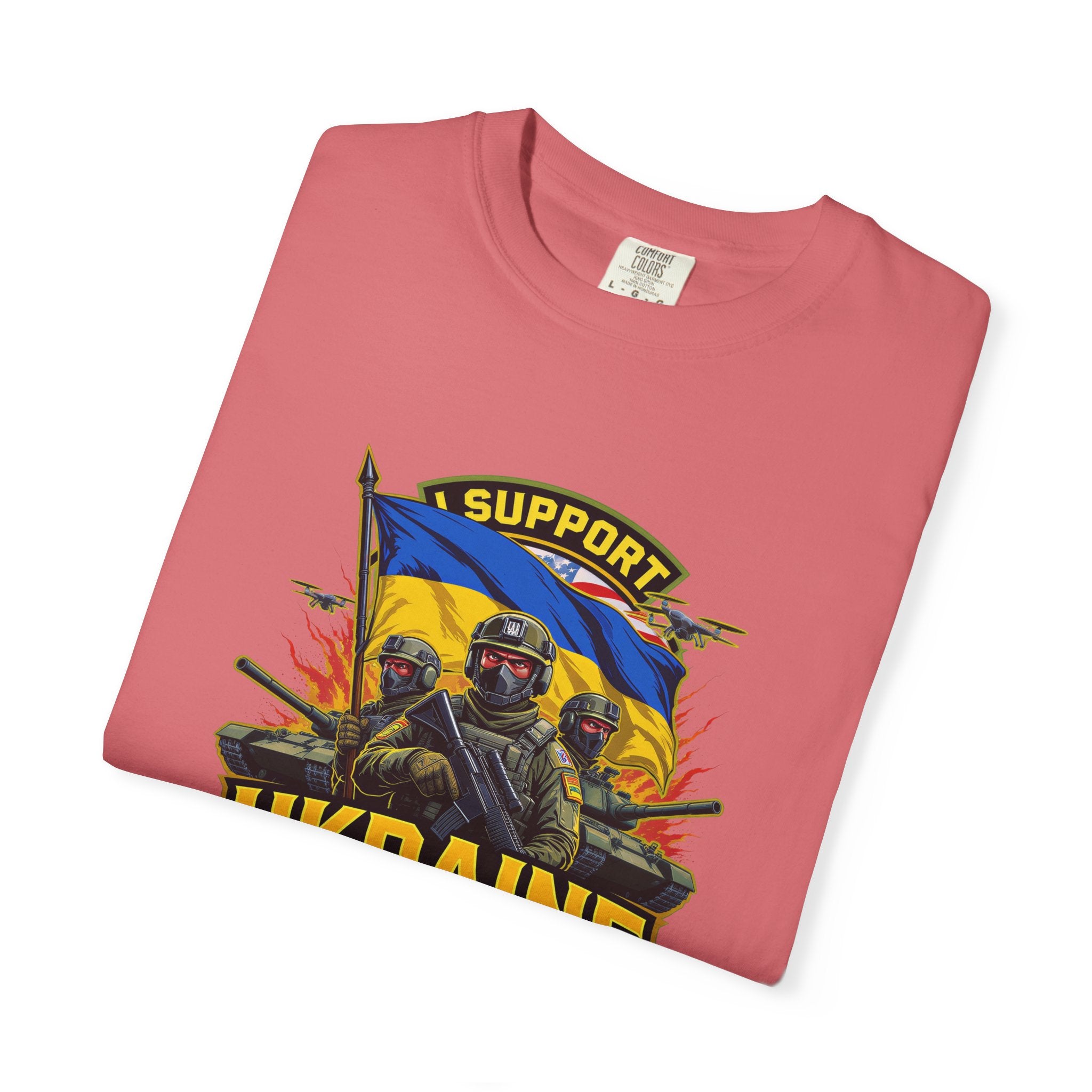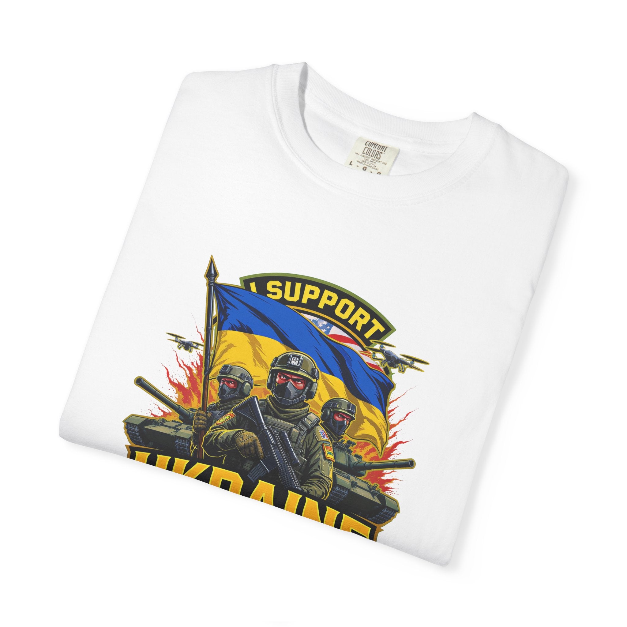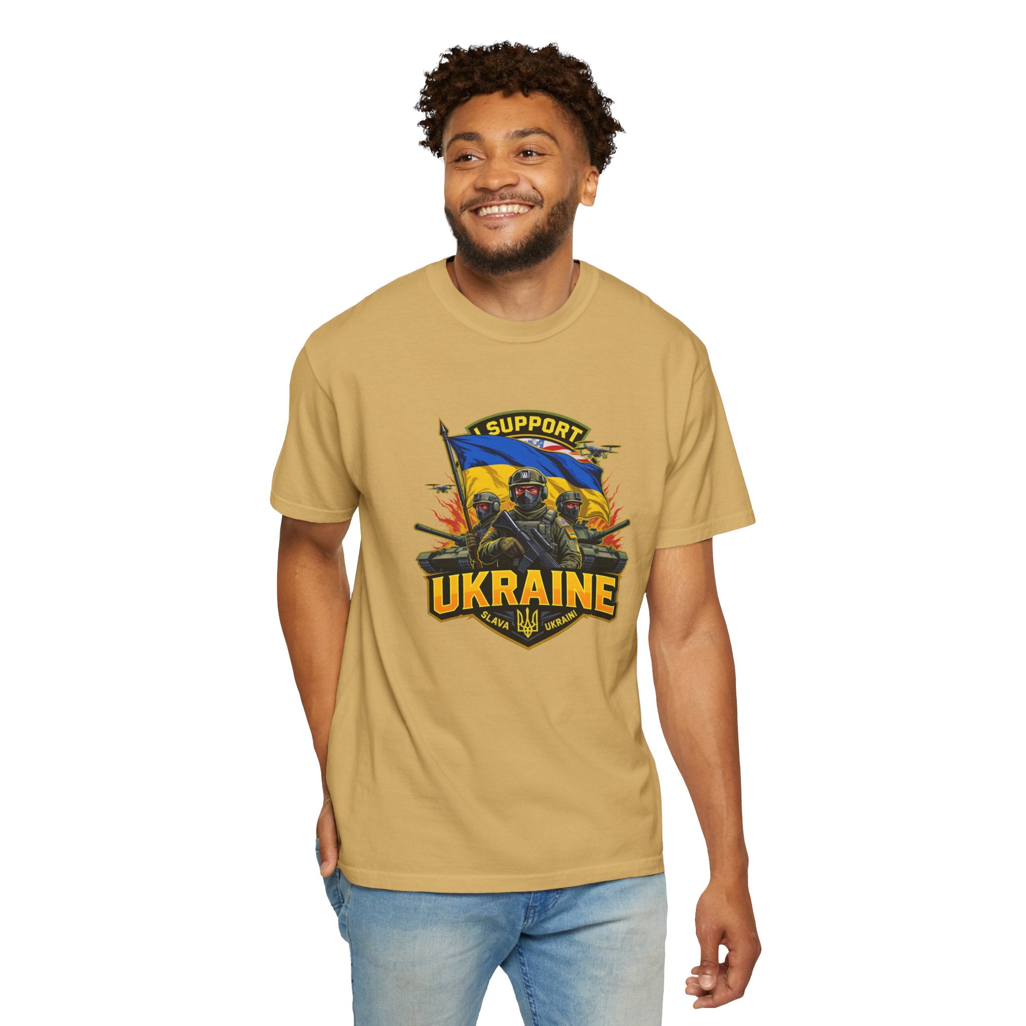 Embrace comfort and style with this 'I Support Ukraine!' Cart, dyed t-shirt. Crafted from 100% ring-spun US cotton, it offers...
