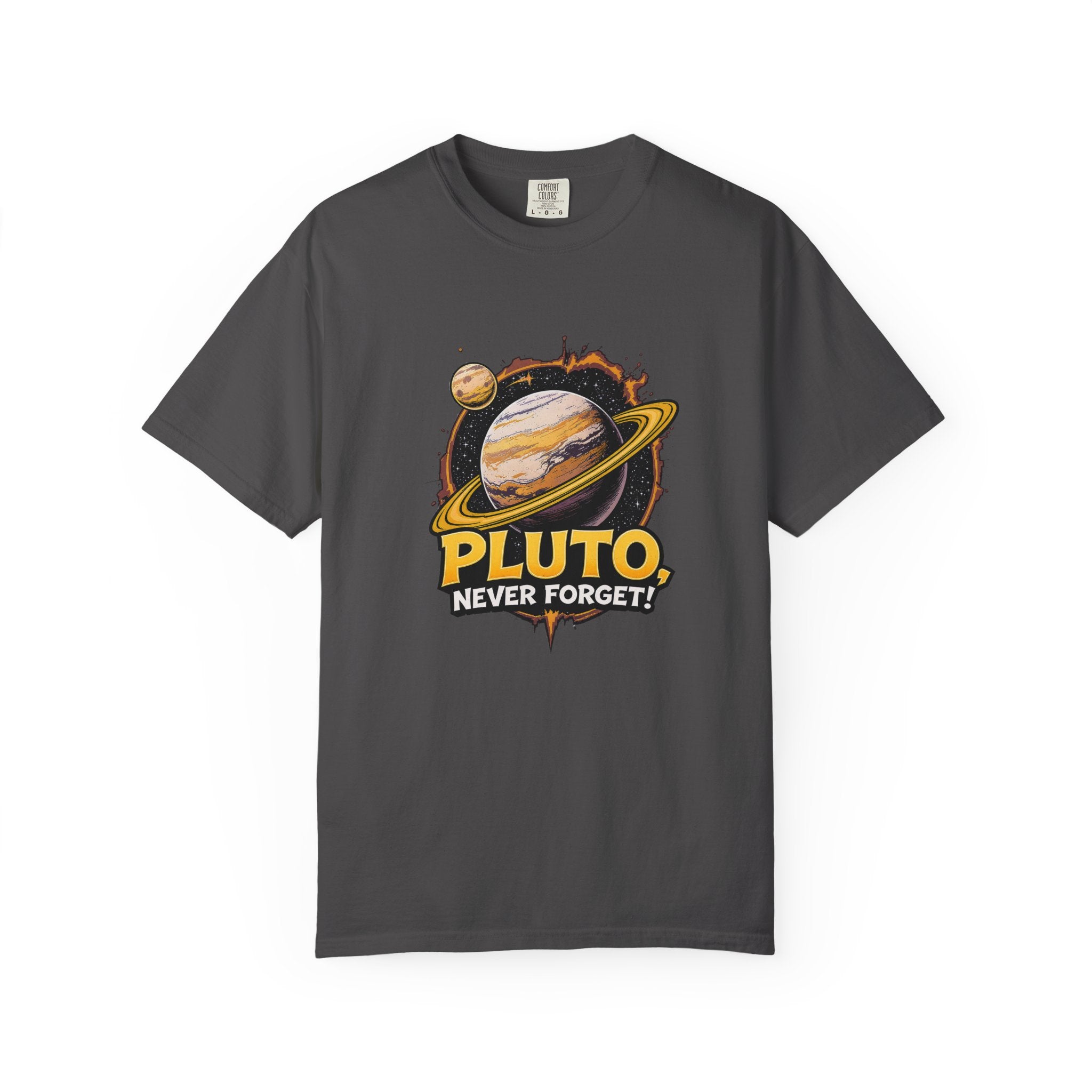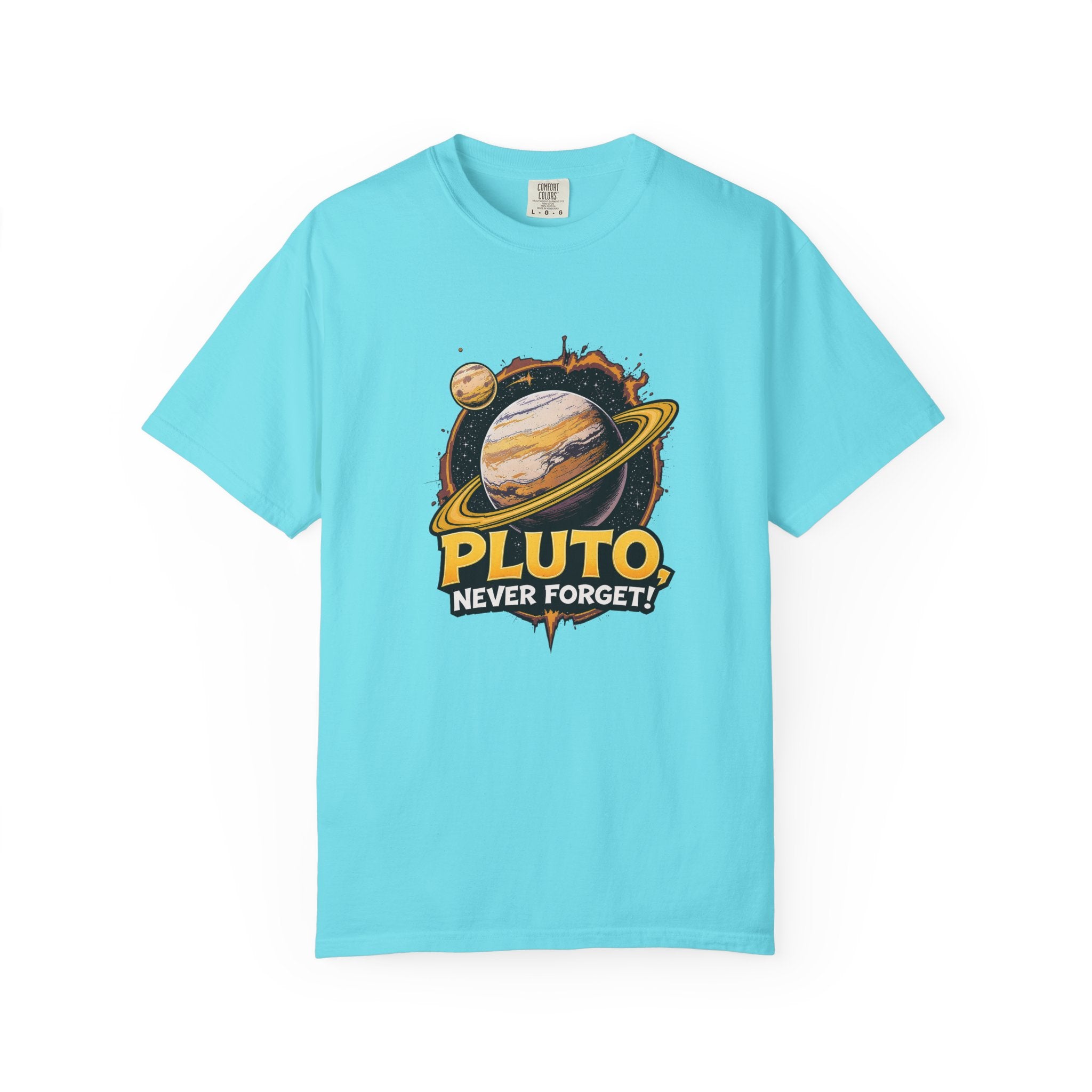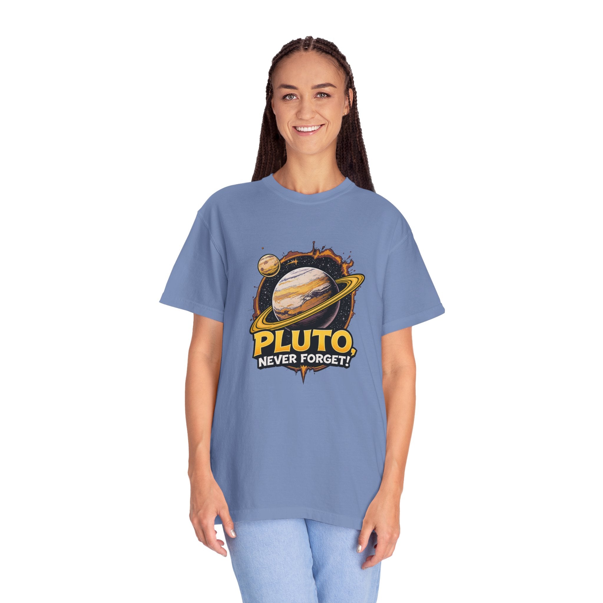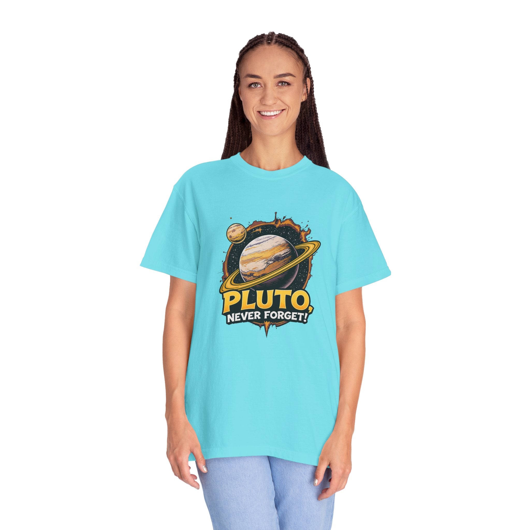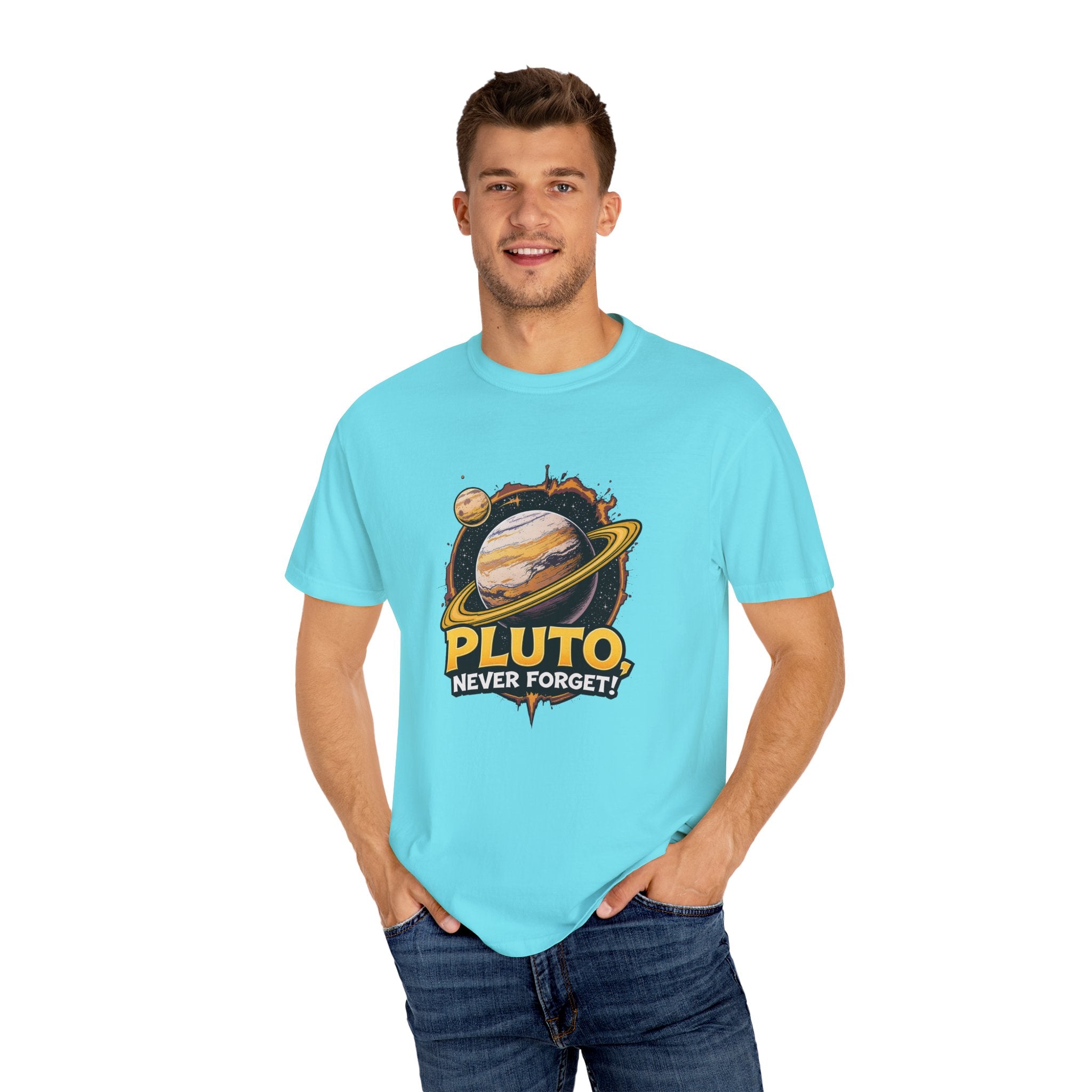 Embrace comfort and style with this 'Pluto, Never Forget!' Cart dyed t-shirt. Crafted from 100% ring-spun US cotton, it offers...