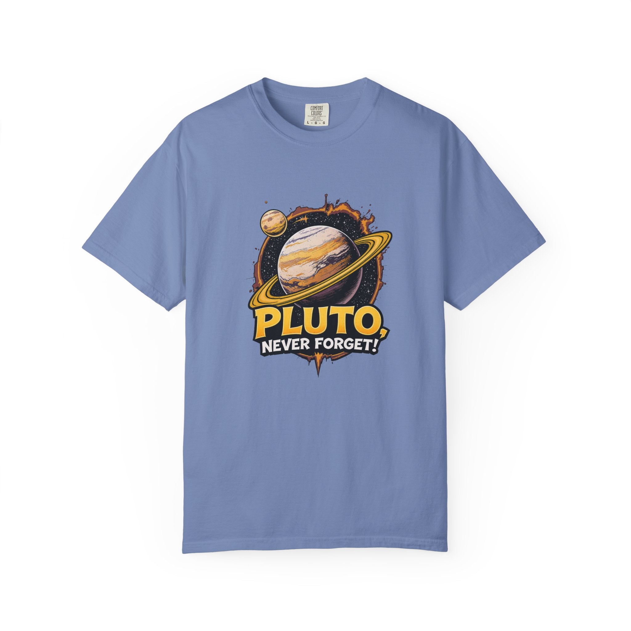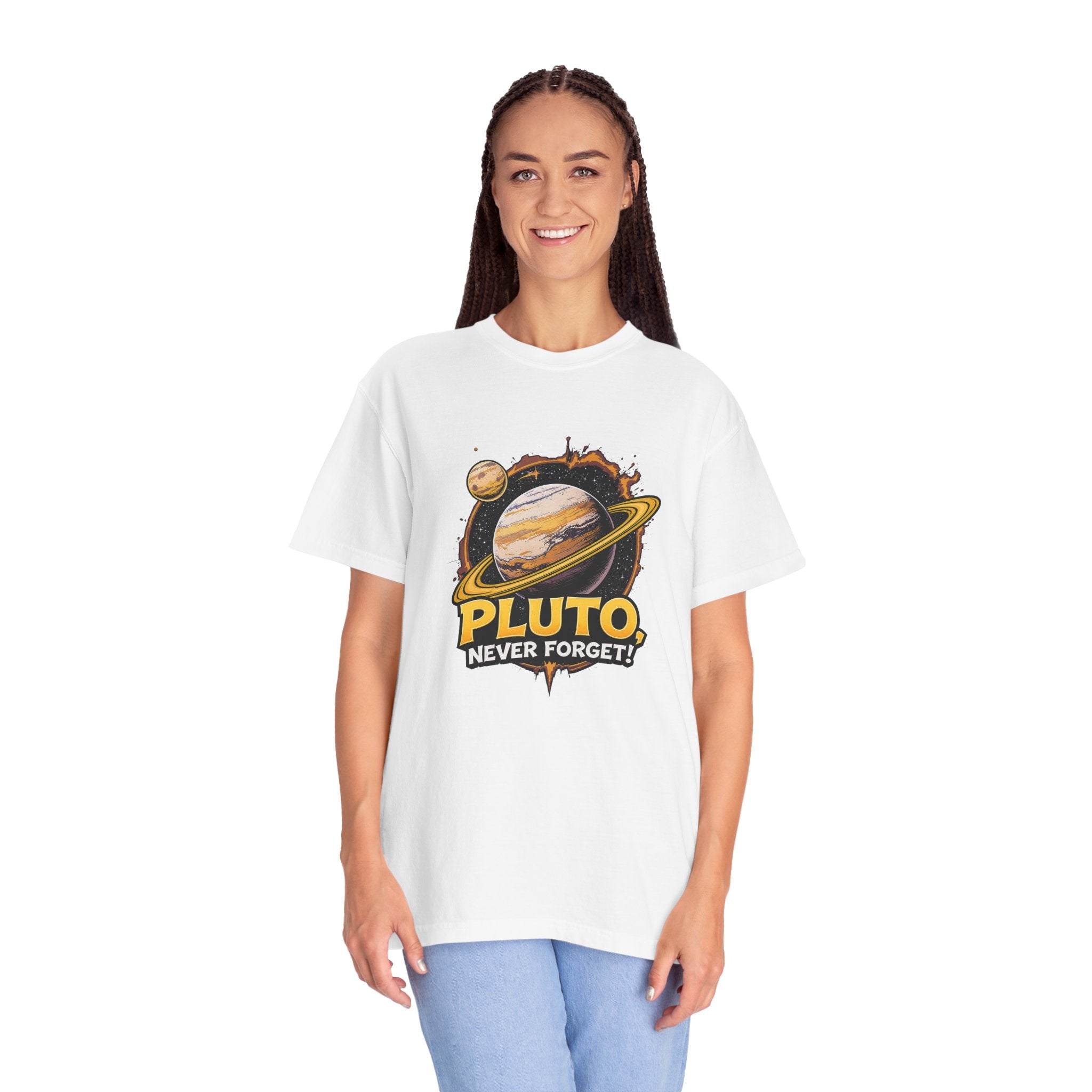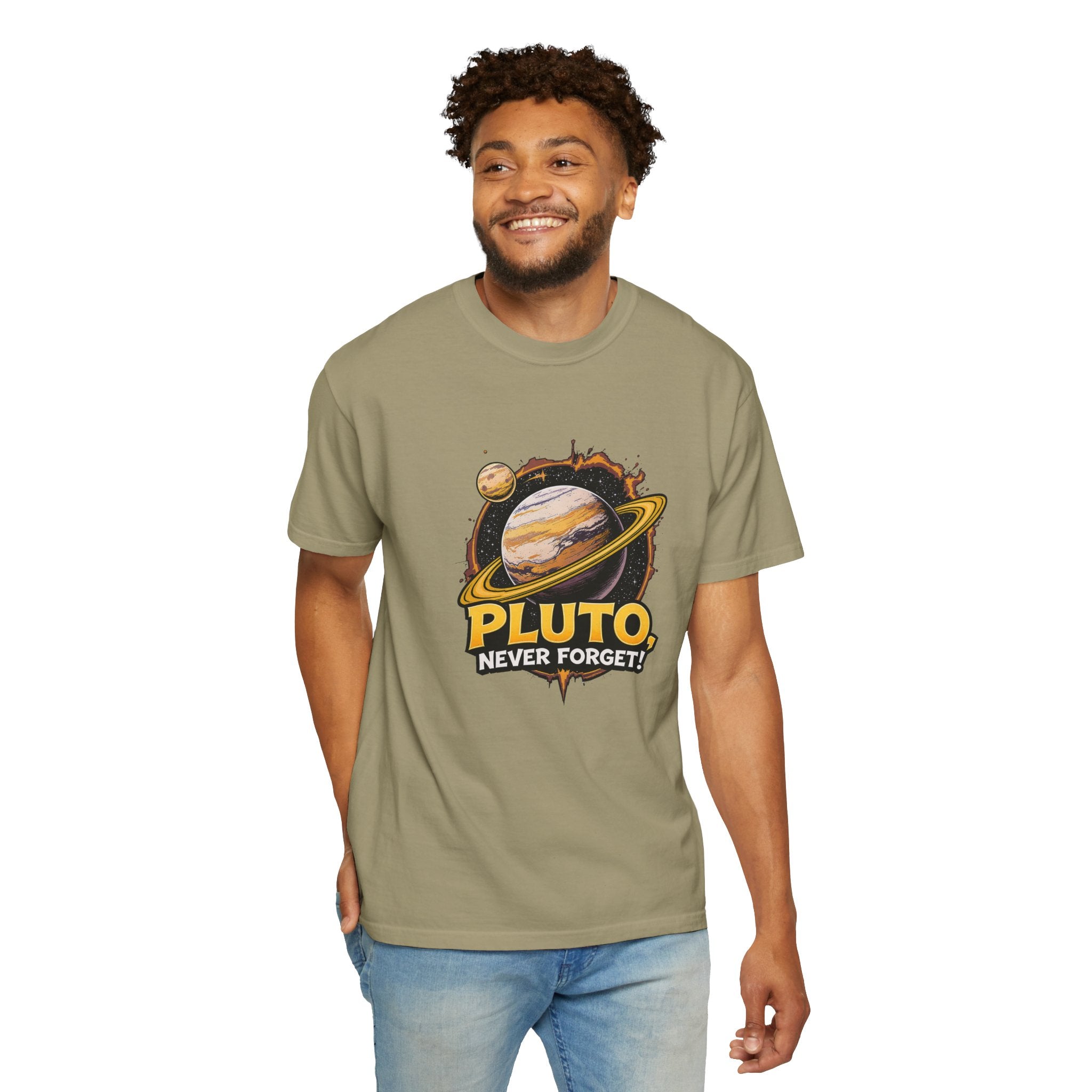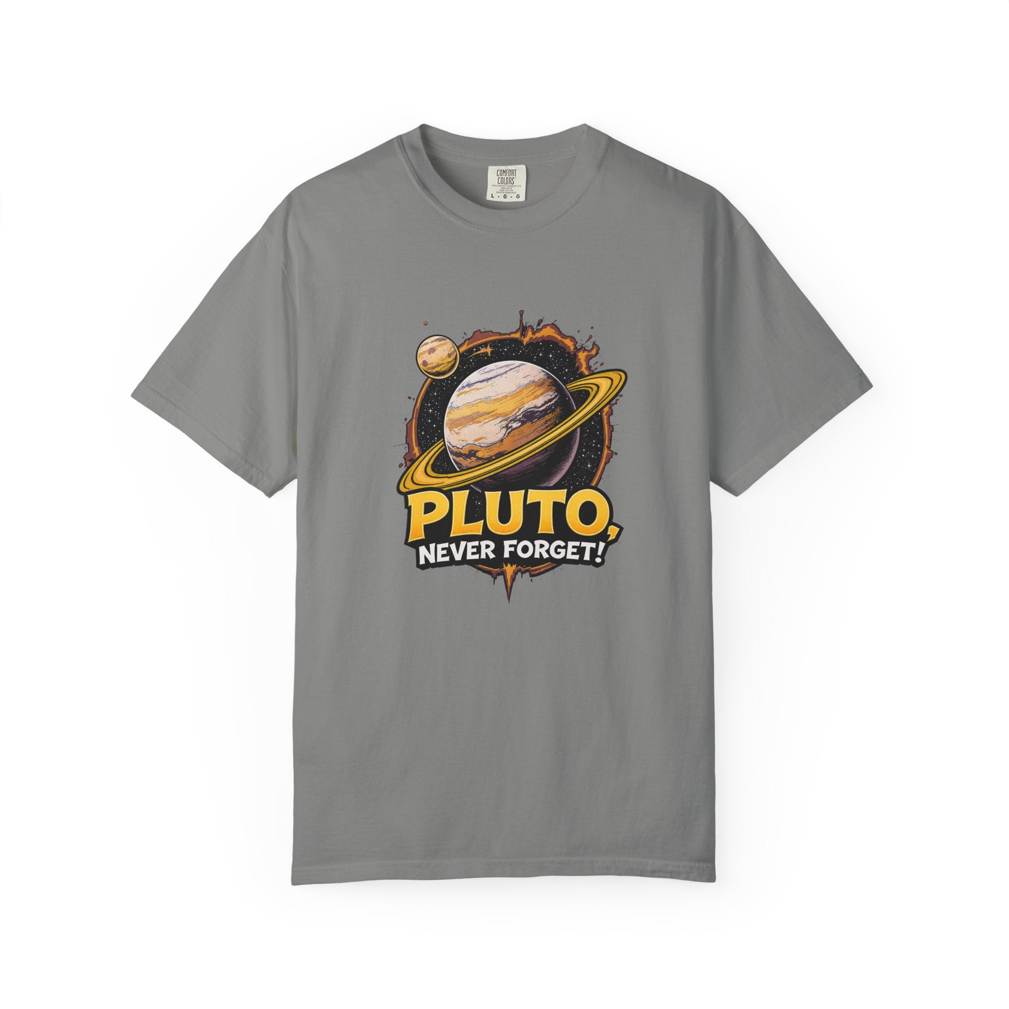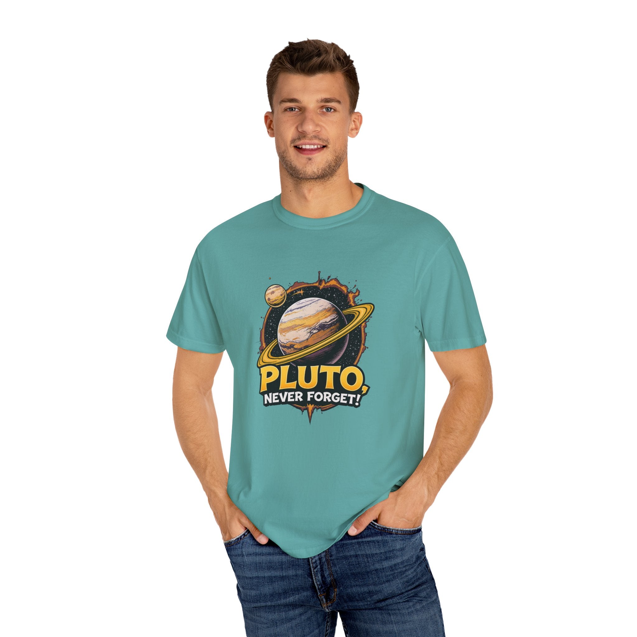 Embrace comfort and style with this 'Pluto, Never Forget!' Cart dyed t-shirt. Crafted from 100% ring-spun US cotton, it offers...