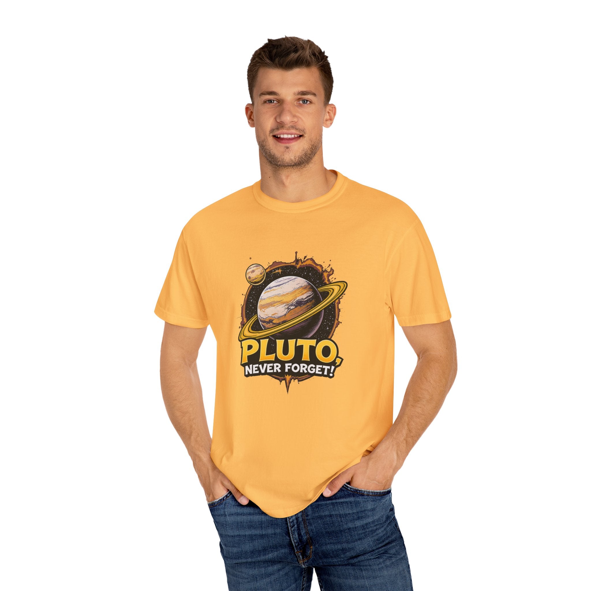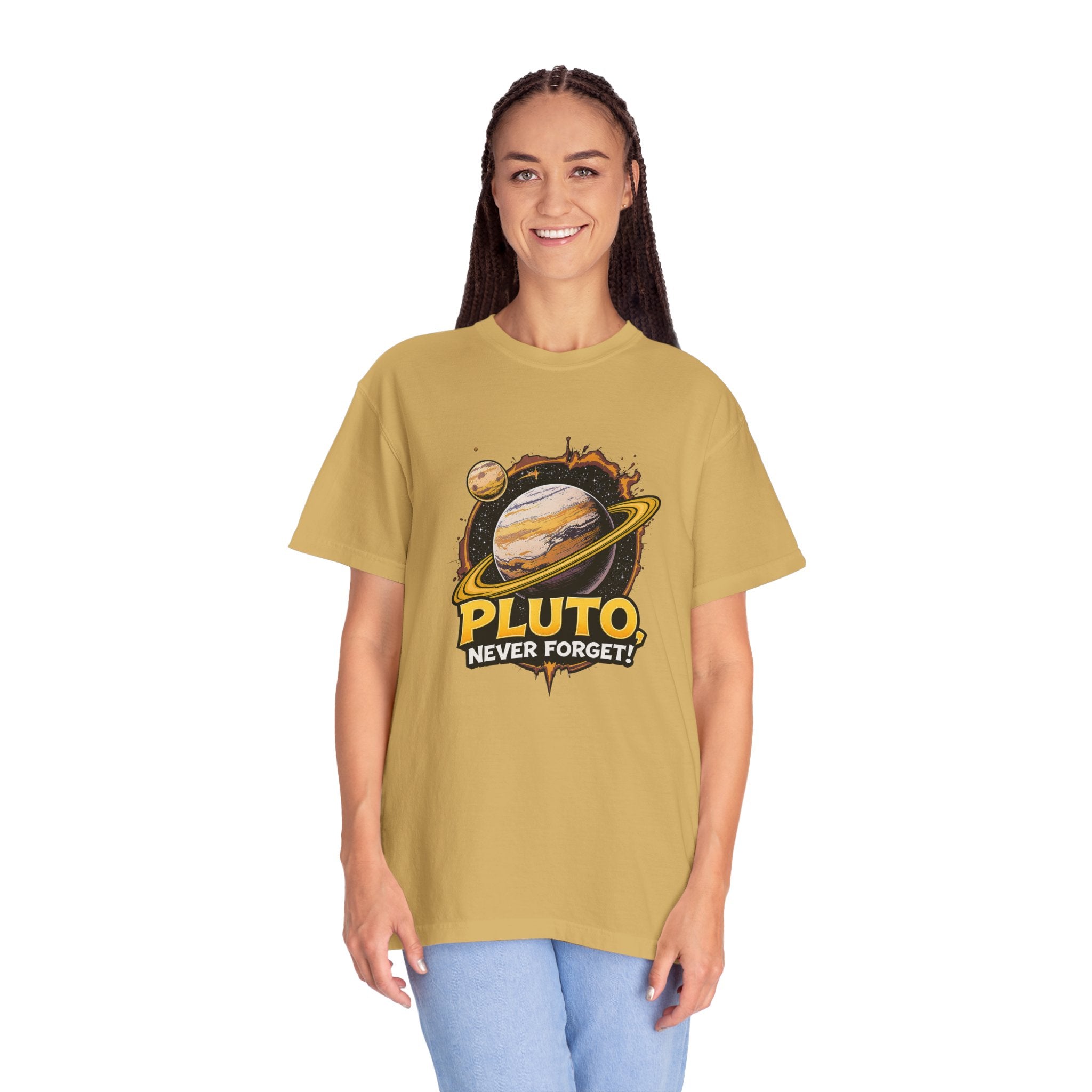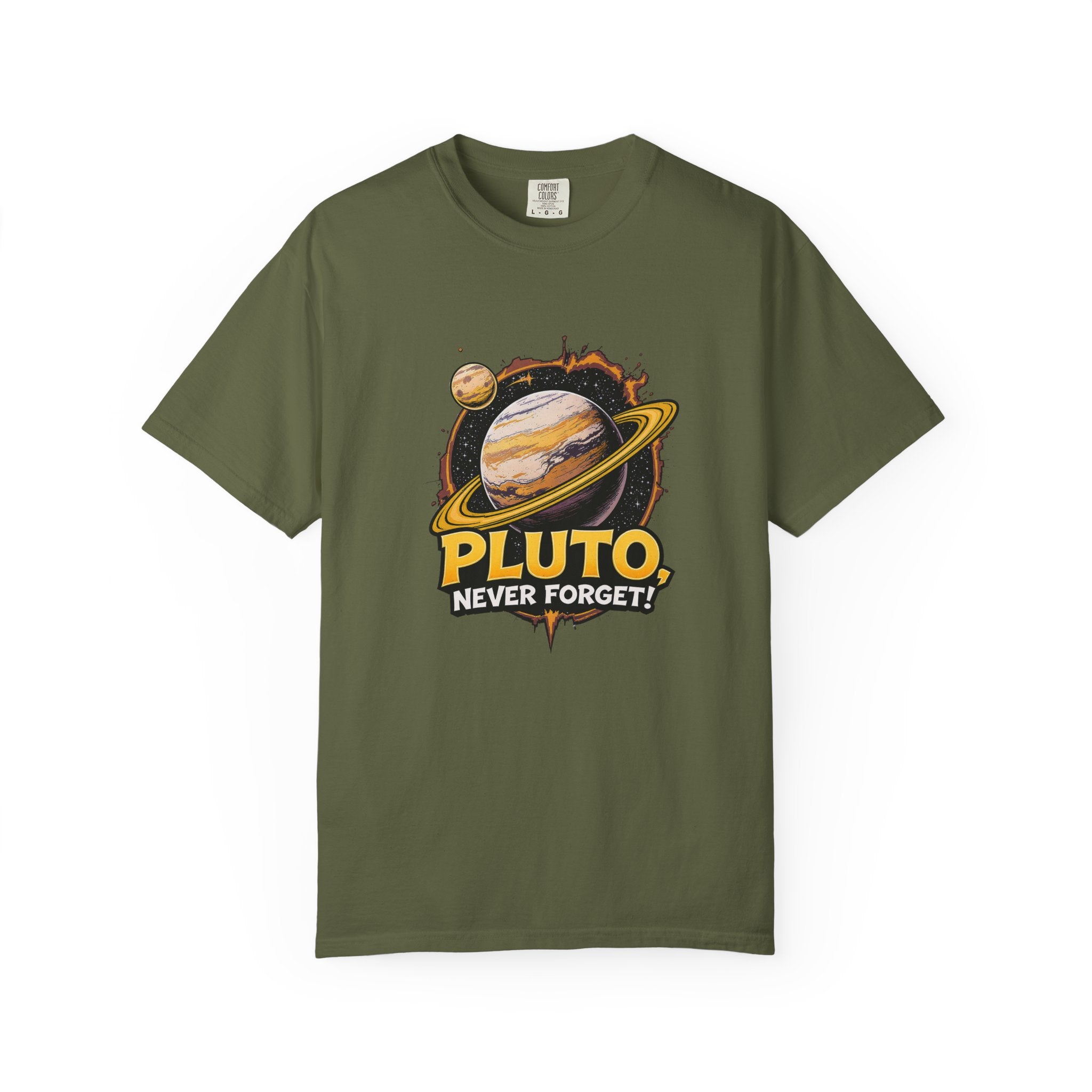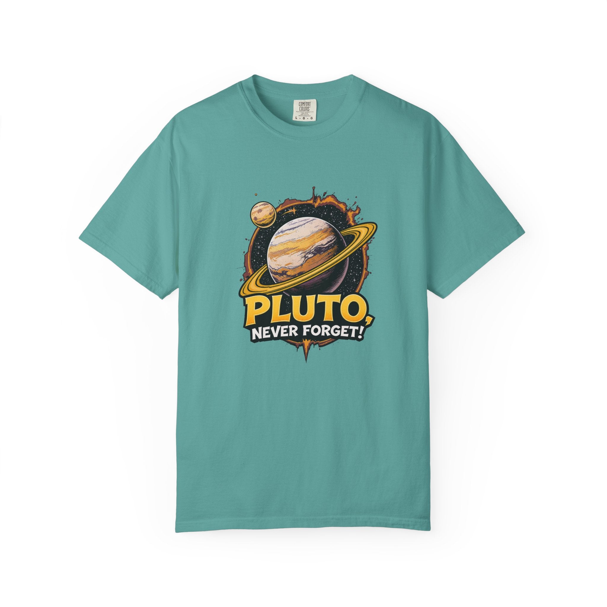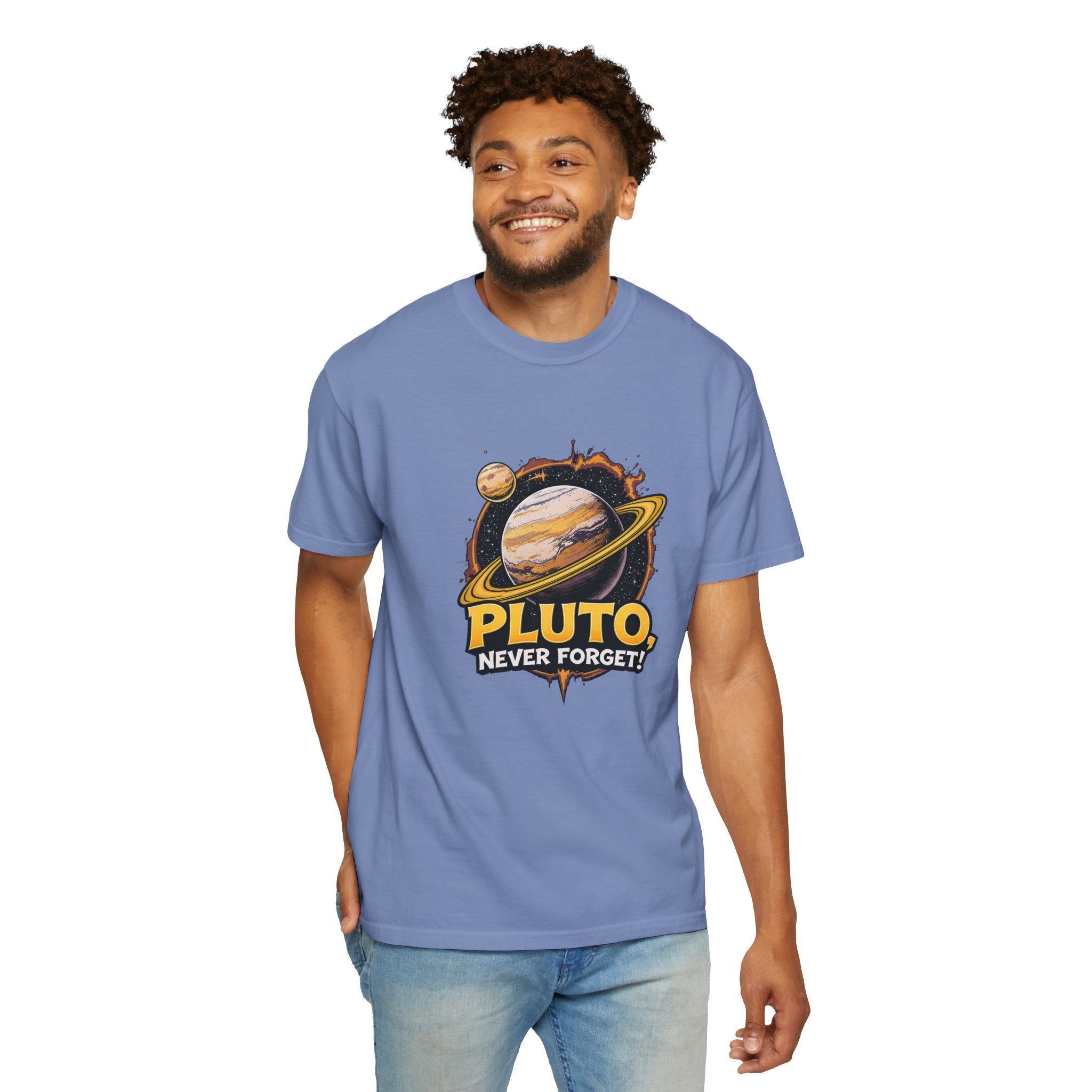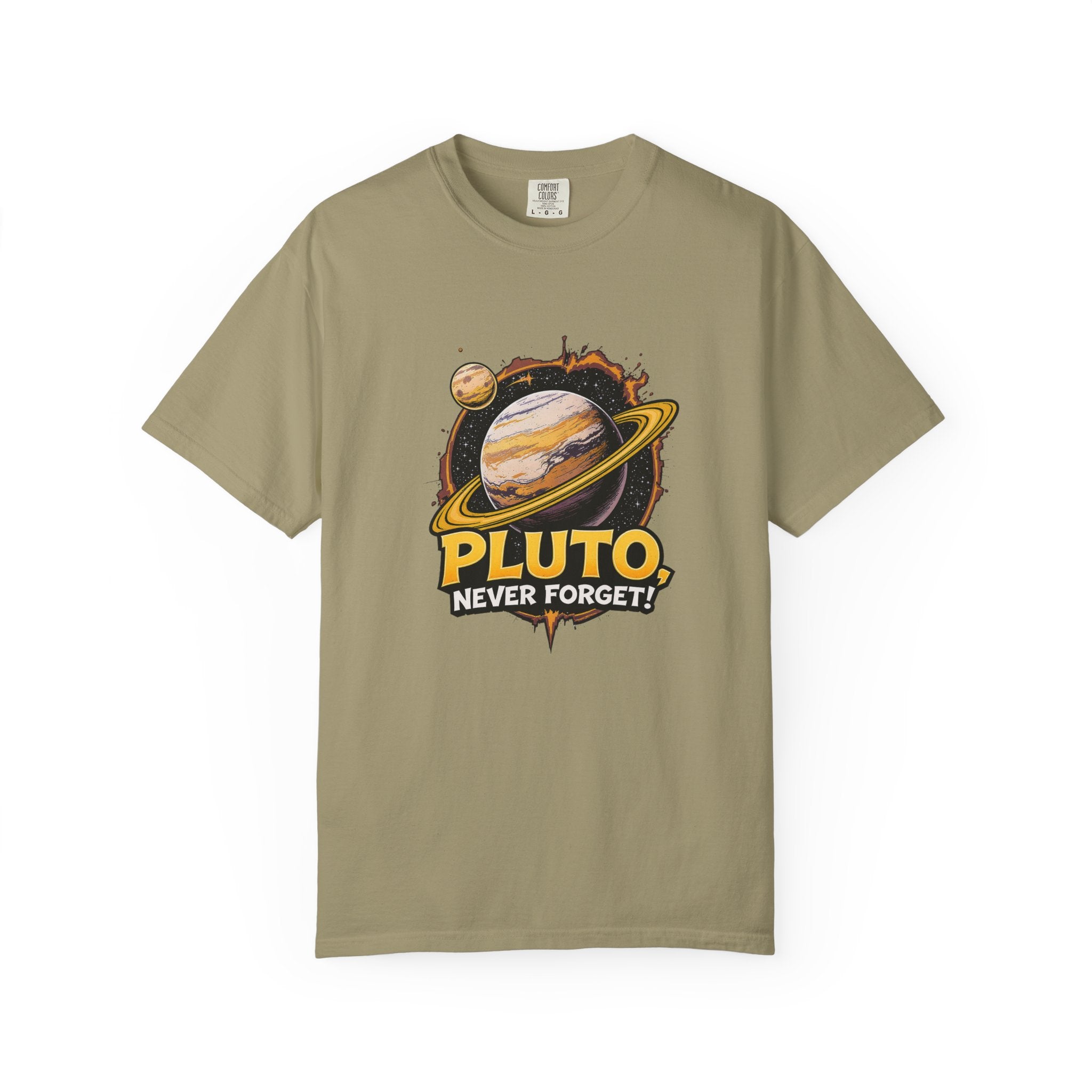 Embrace comfort and style with this 'Pluto, Never Forget!' Cart dyed t-shirt. Crafted from 100% ring-spun US cotton, it offers...