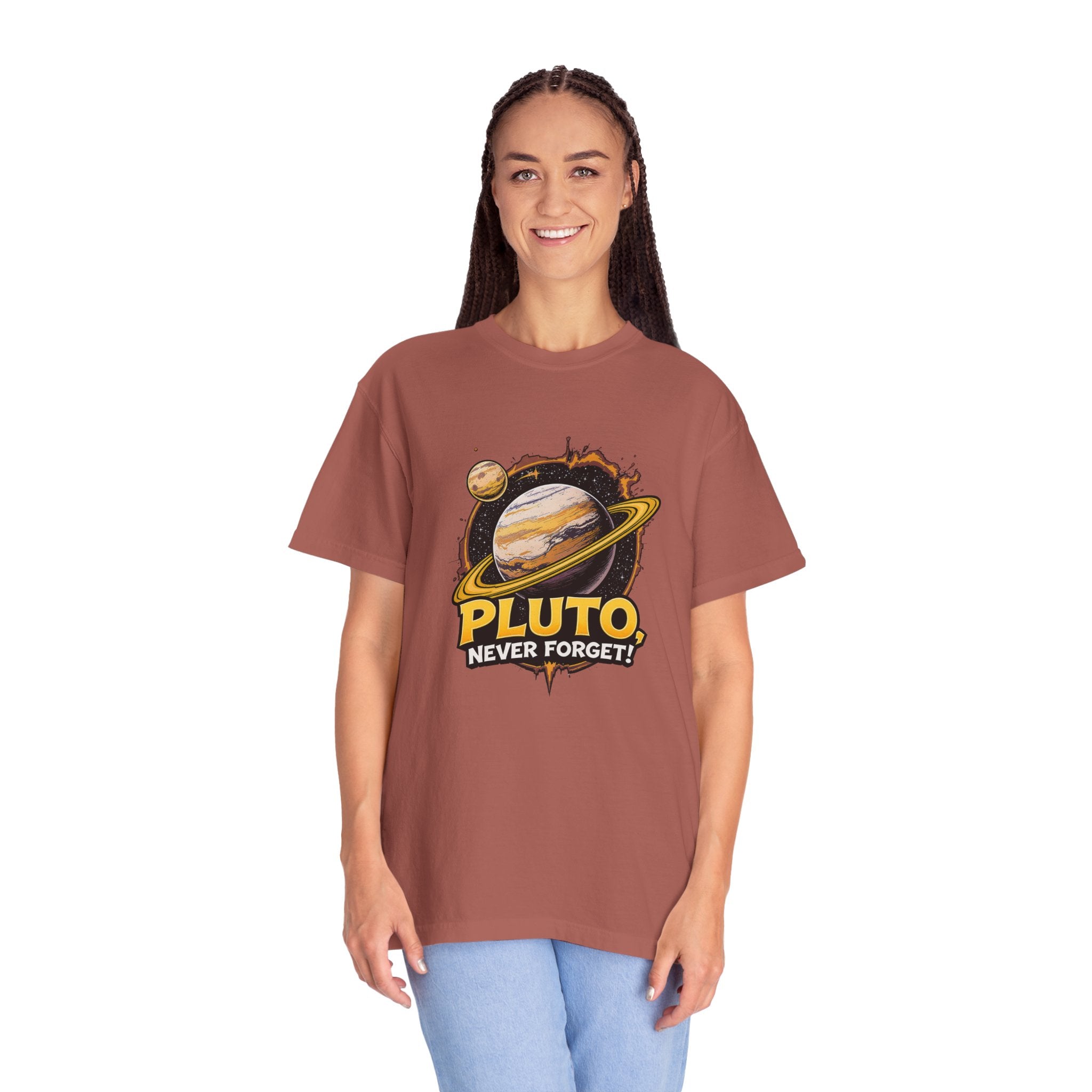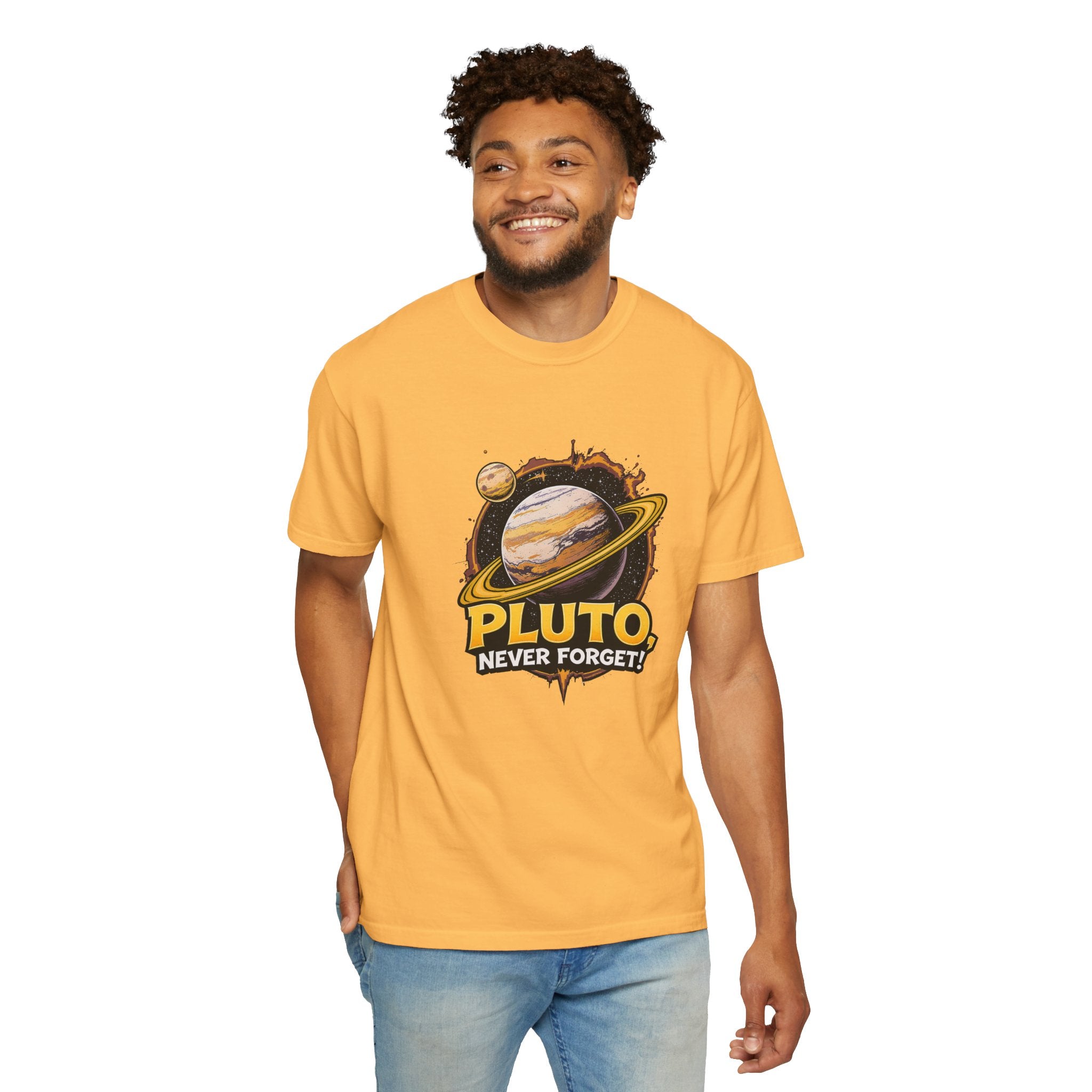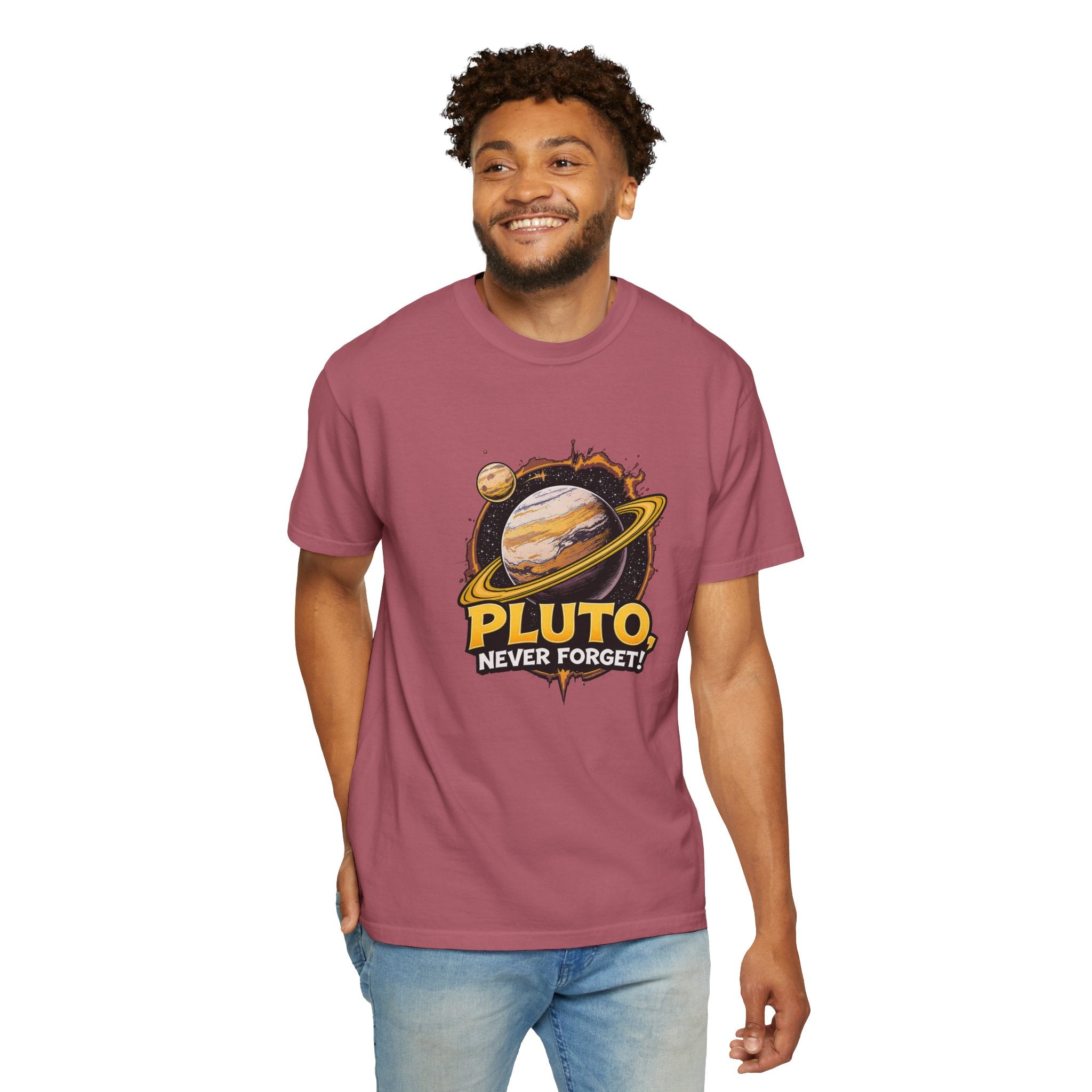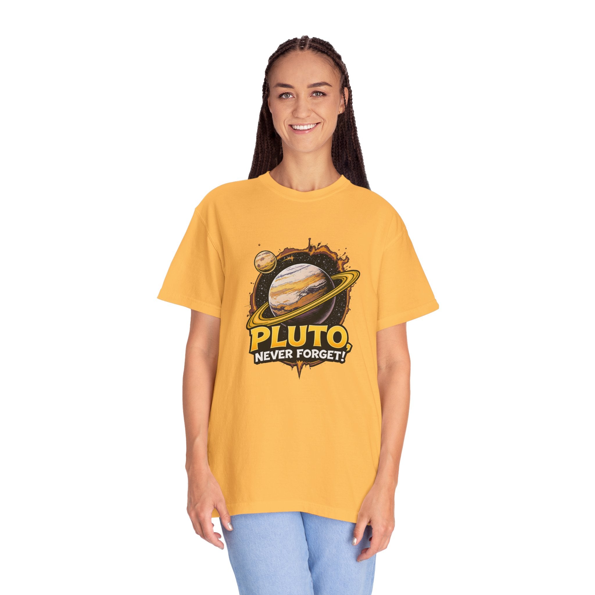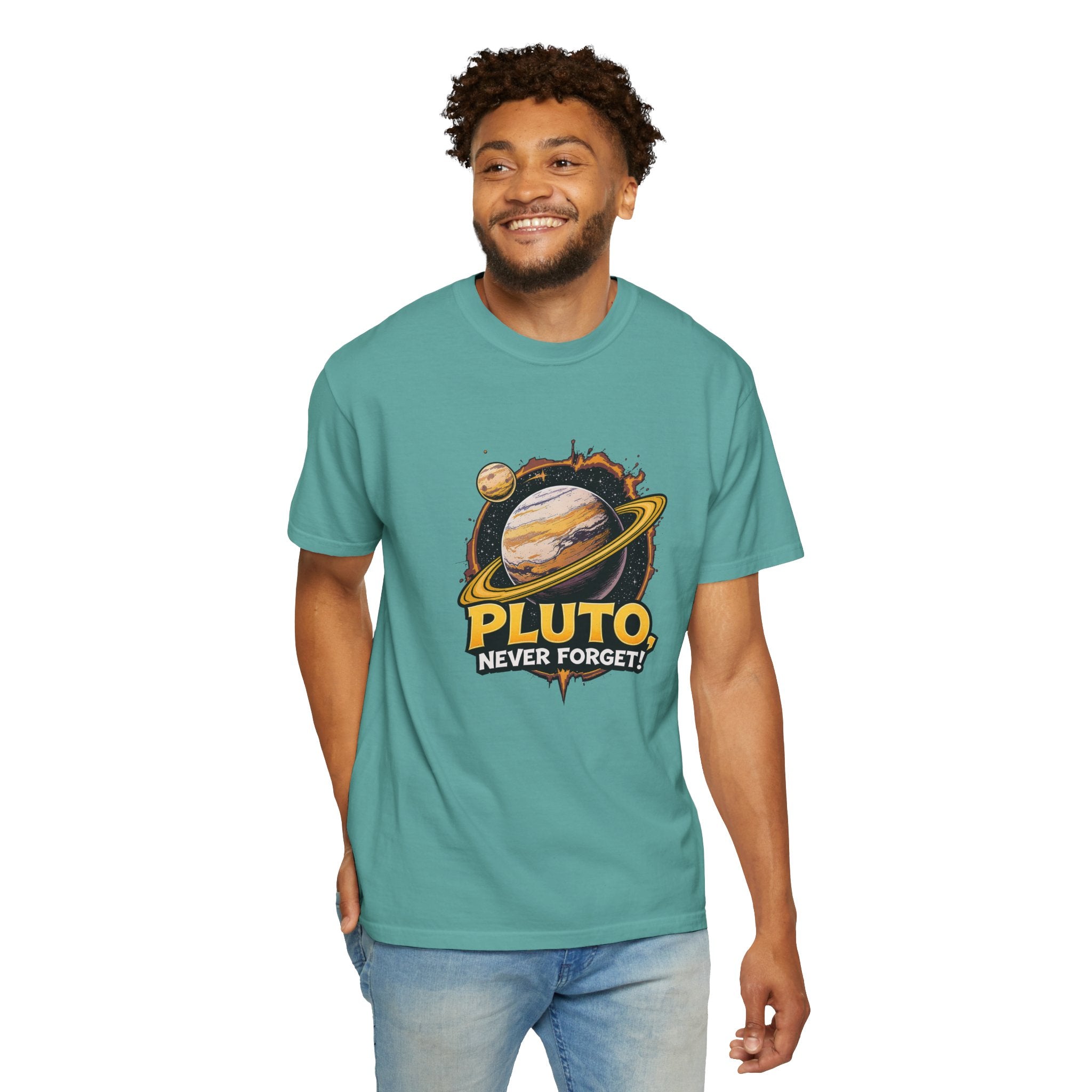 Embrace comfort and style with this 'Pluto, Never Forget!' Cart dyed t-shirt. Crafted from 100% ring-spun US cotton, it offers...